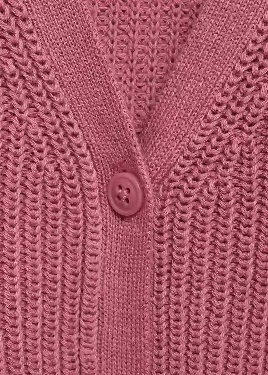 Bavlněná tkanina. Pletená tkanina. Rovný střih. Výstřih do V. Dlouhé rukávy. Zapínání na knoflíky vpředu