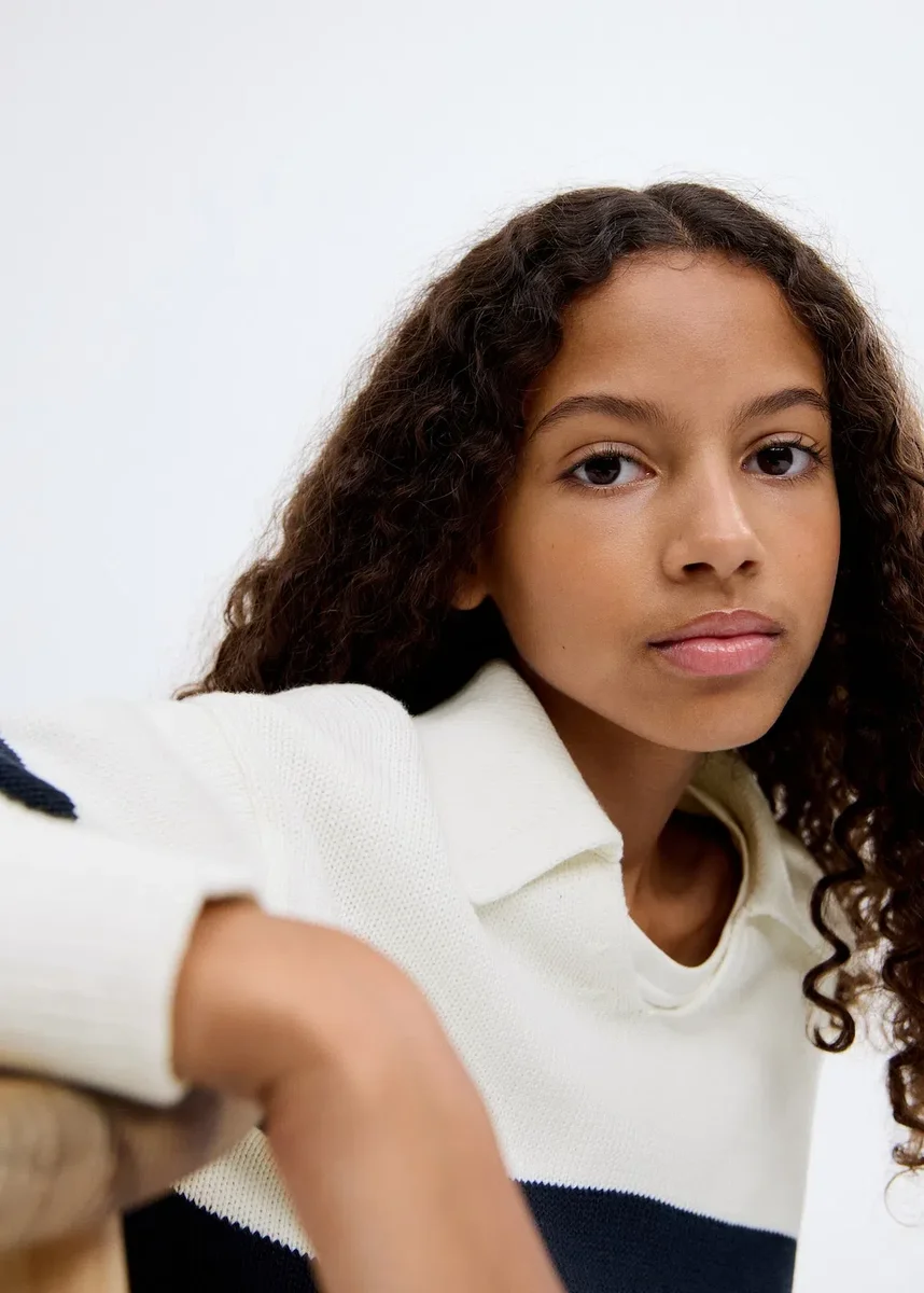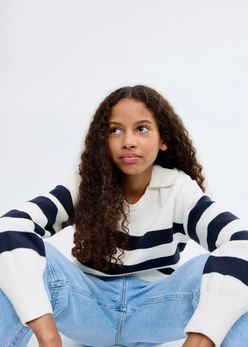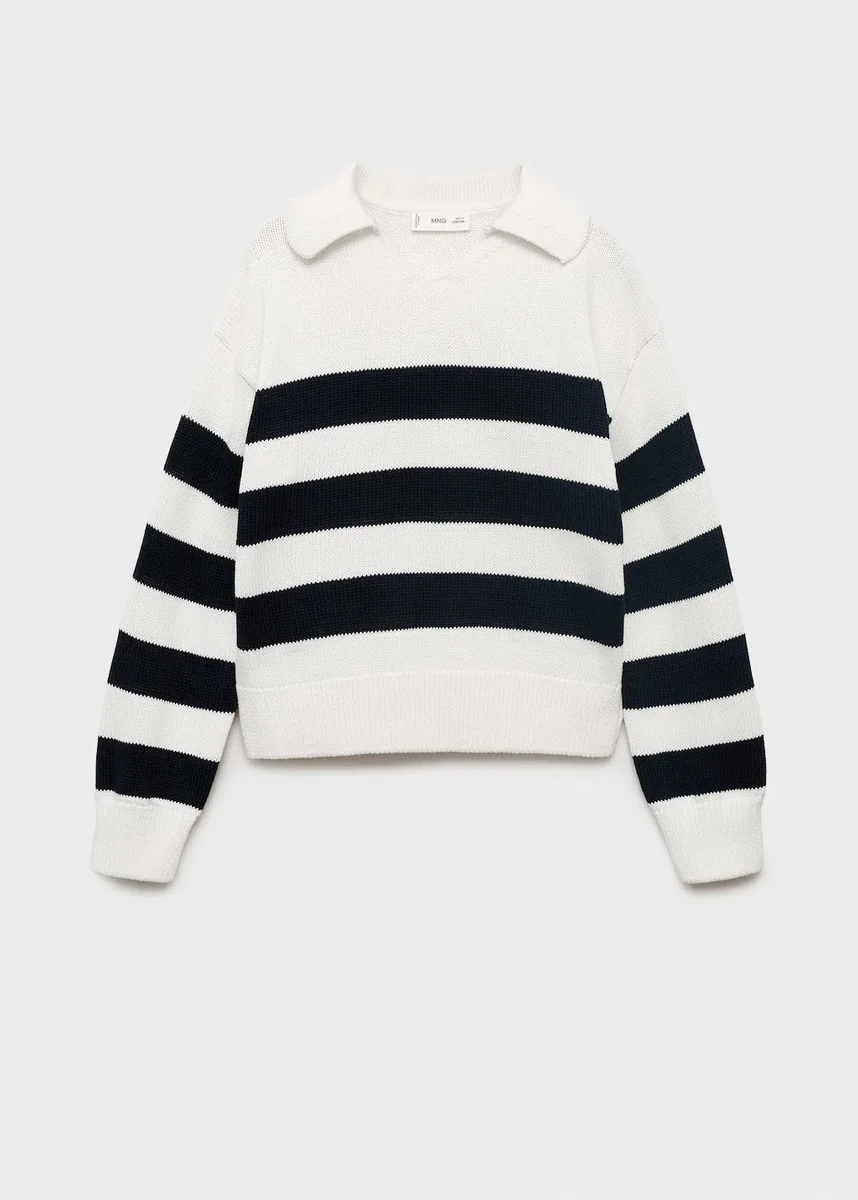 Pletená látka. Pruhovaná látka. Rovný střih. Polo límec. Dlouhý rukáv. Žebrovaný výstřih, manžety a lem