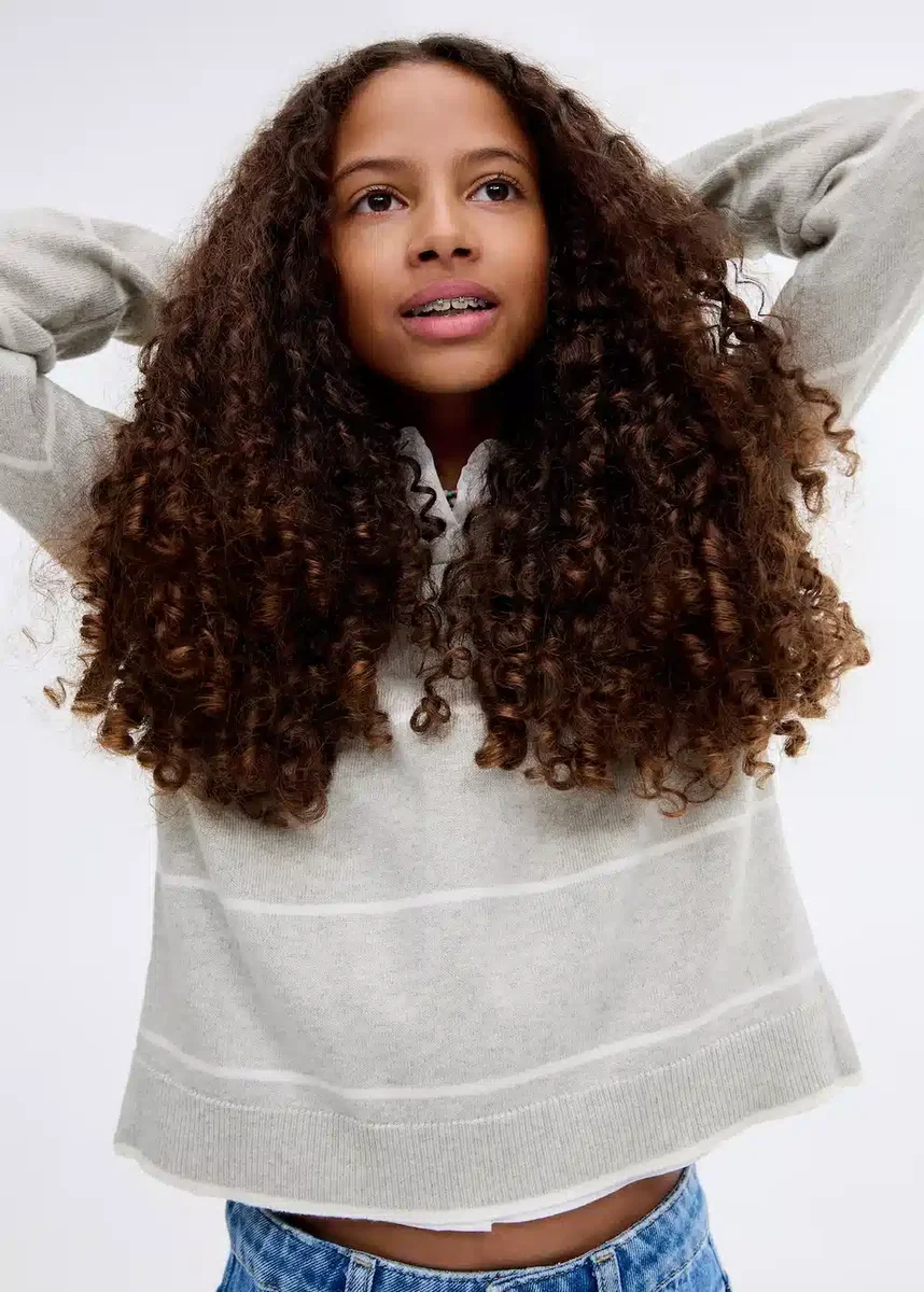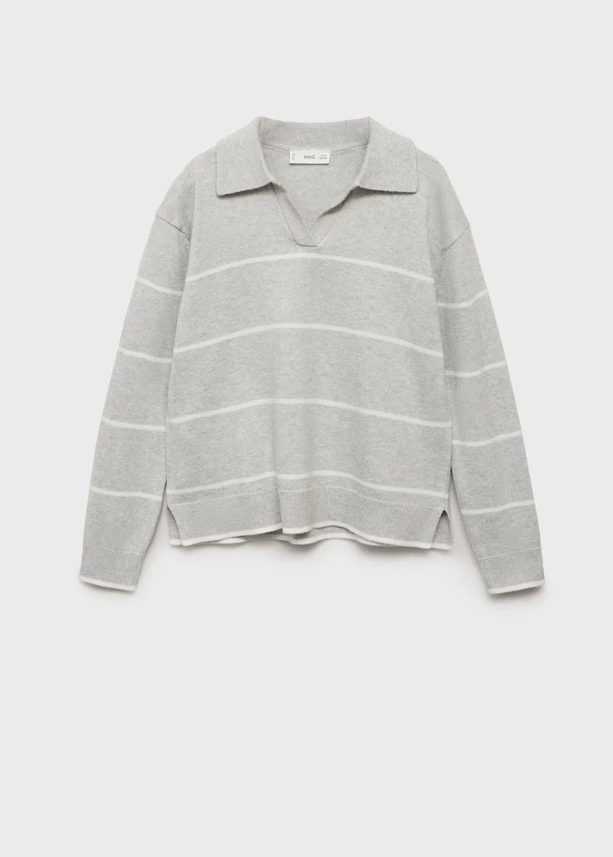 Bavlněná tkanina. Pletená tkanina. Rovný střih. Pruhovaný design. Polo tričko s límečkem bez knoflíků. Dlouhé rukávy. Boční rozparek na spodním lemu.