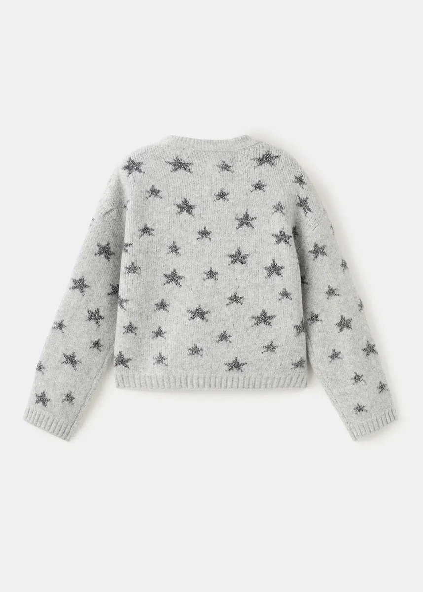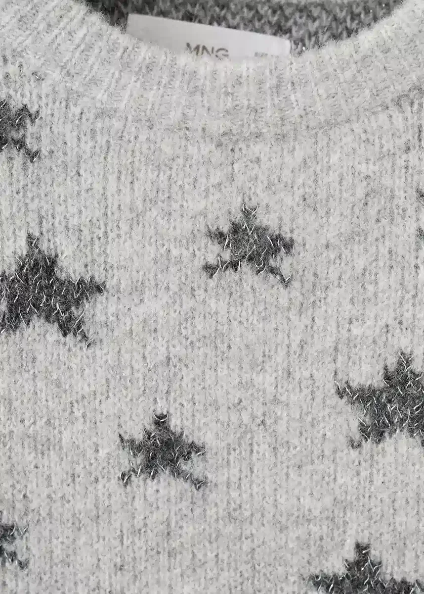 Pletená tkanina. Lurexová tkanina. Lesklý design. Hvězdicový vzor. Kulatý výstřih. Dlouhé rukávy. Žebrovaný výstřih, manžety a lem.