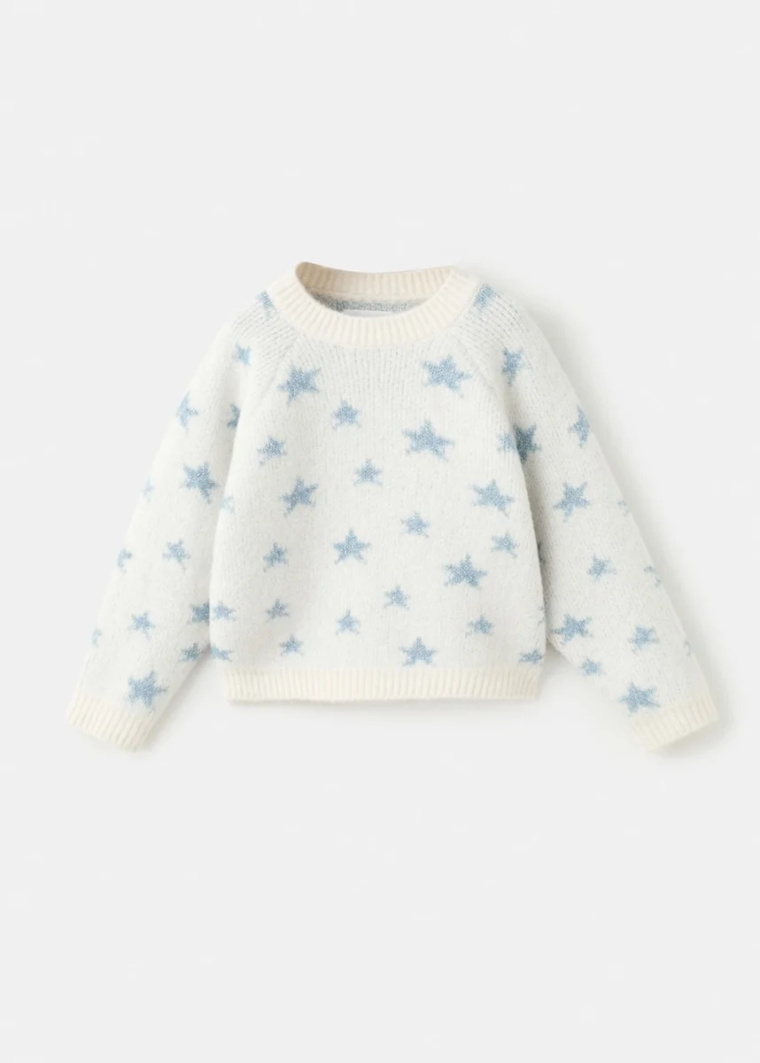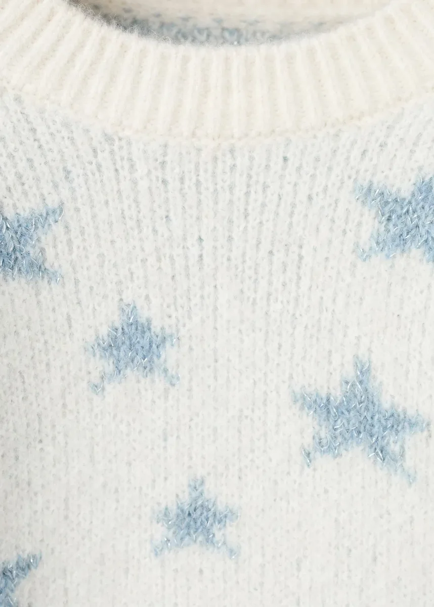 Pletená látka. Lurexová látka. Rovný střih. Hvězdicový vzor. Kulatý výstřih. Dlouhé rukávy. Žebrovaný výstřih, manžety a lem.