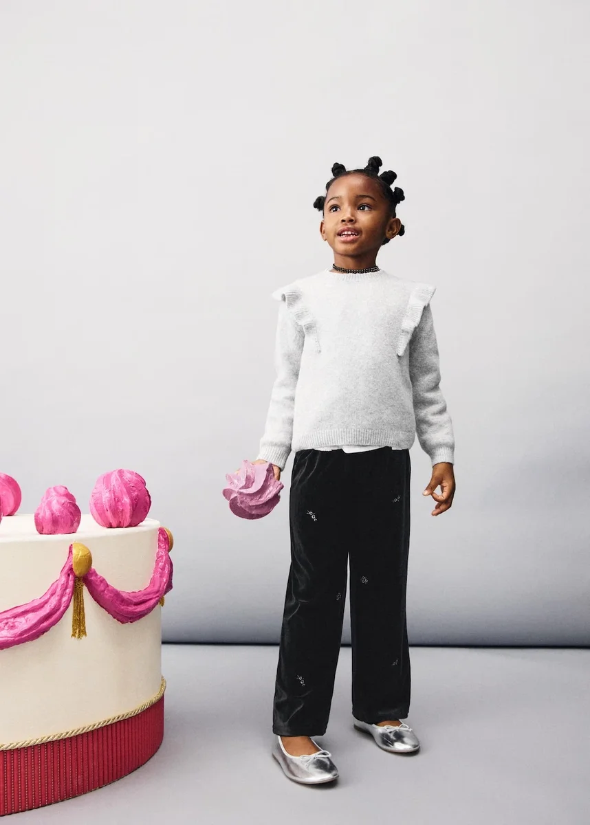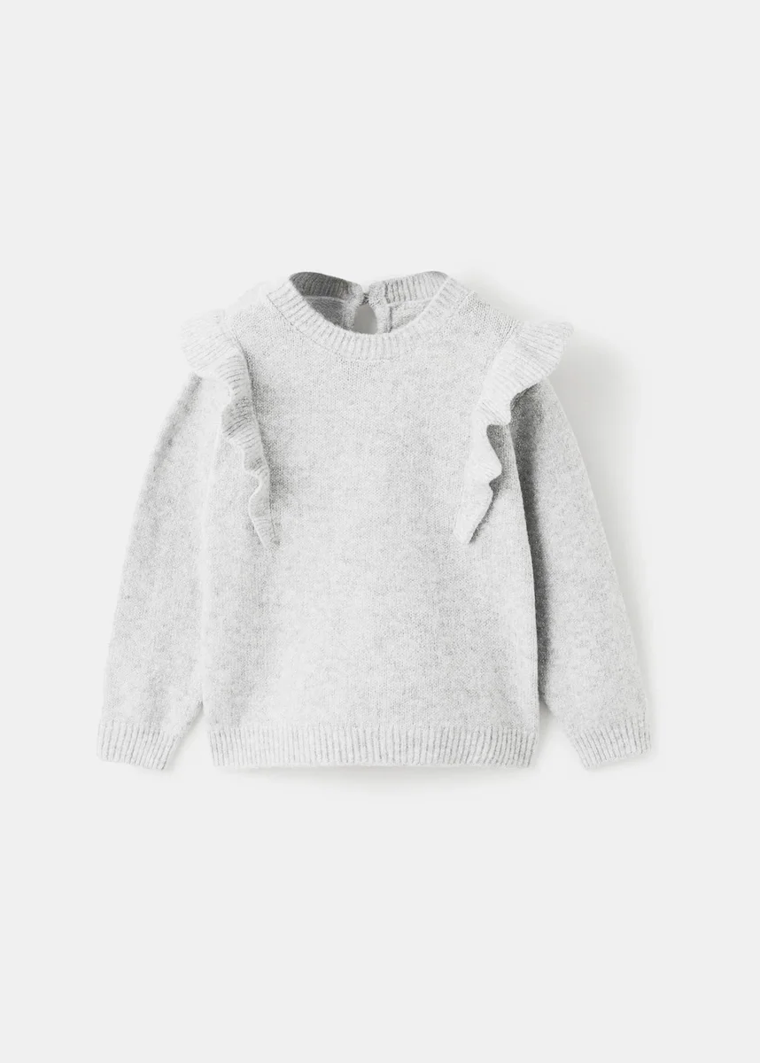 Pletená tkanina. Lurexová tkanina. Rovný střih. Kulatý výstřih. Dlouhé rukávy. Volánky na ramenou. Žebrované lemy. Zapínání na knoflíky vzadu. Party kolekce. Vánoční kolekce. Black Friday.