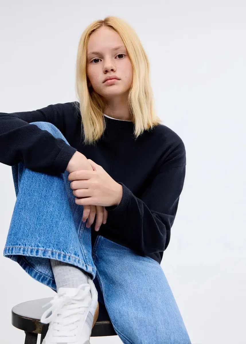 100% bavlna. Pletená látka. Rovný střih. Kulatý výstřih. Dlouhé rukávy. Žebrovaný výstřih, manžety a lem. Prošívání na přední straně.