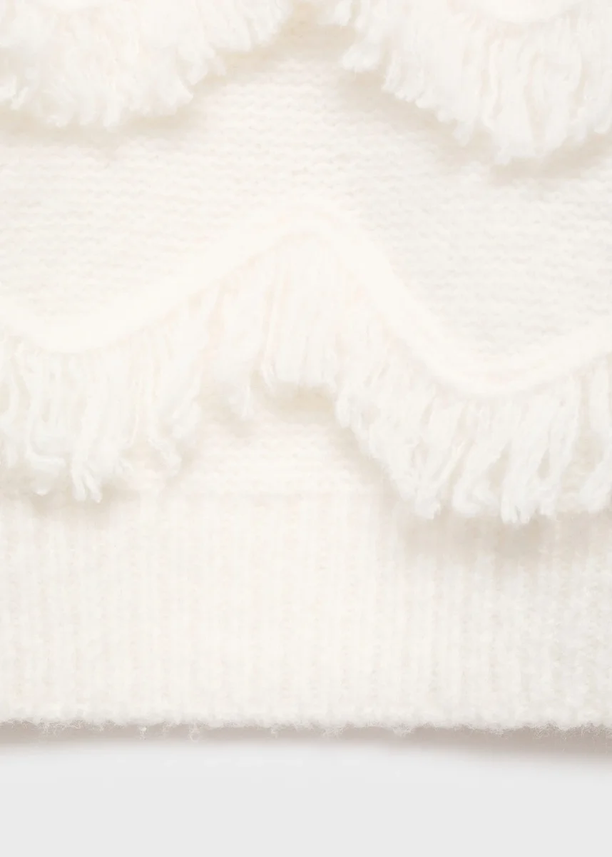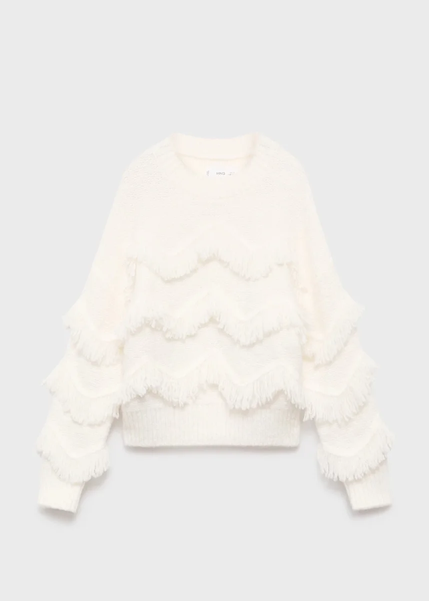 Pletená látka. Rovný střih. Střapcový design. Střapcová aplikace. Kulatý výstřih. Dlouhý rukáv