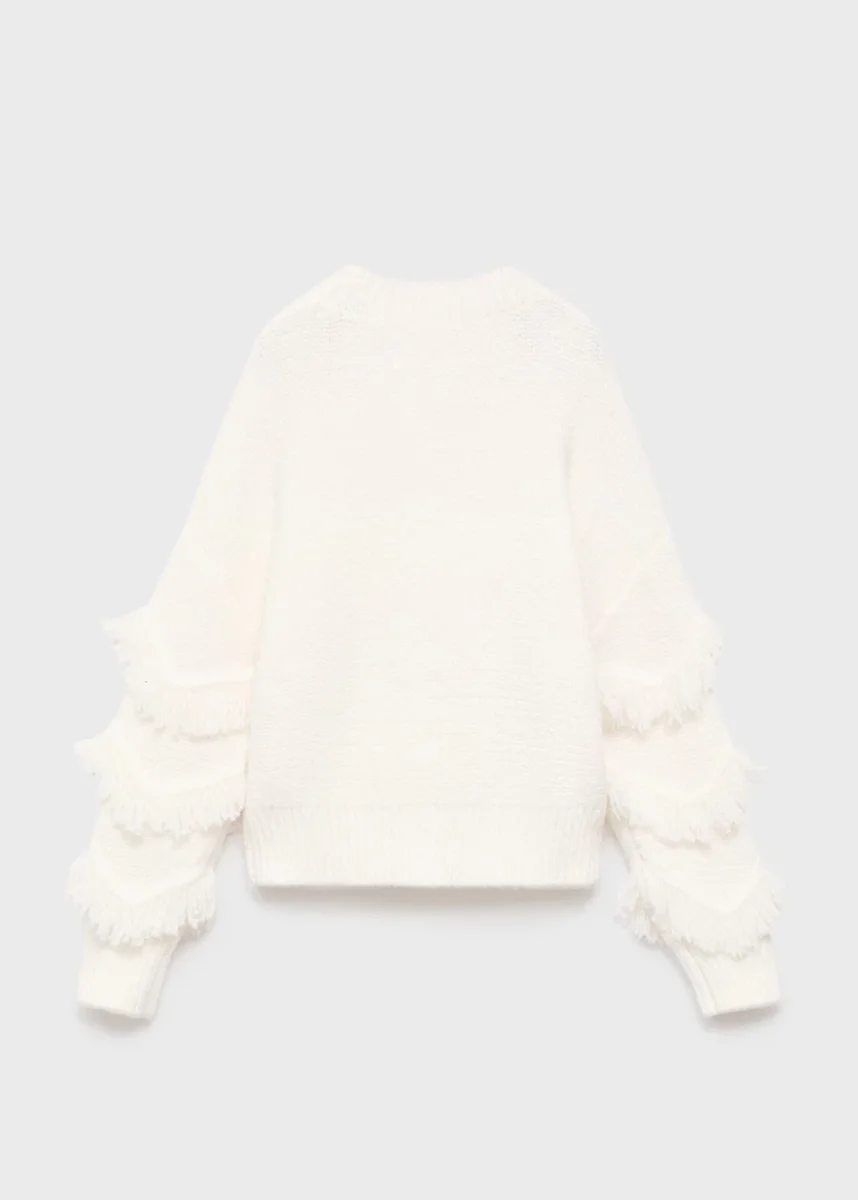 Pletená látka. Rovný střih. Třásně. Aplikace třásní. Kulatý výstřih. Dlouhé rukávy.