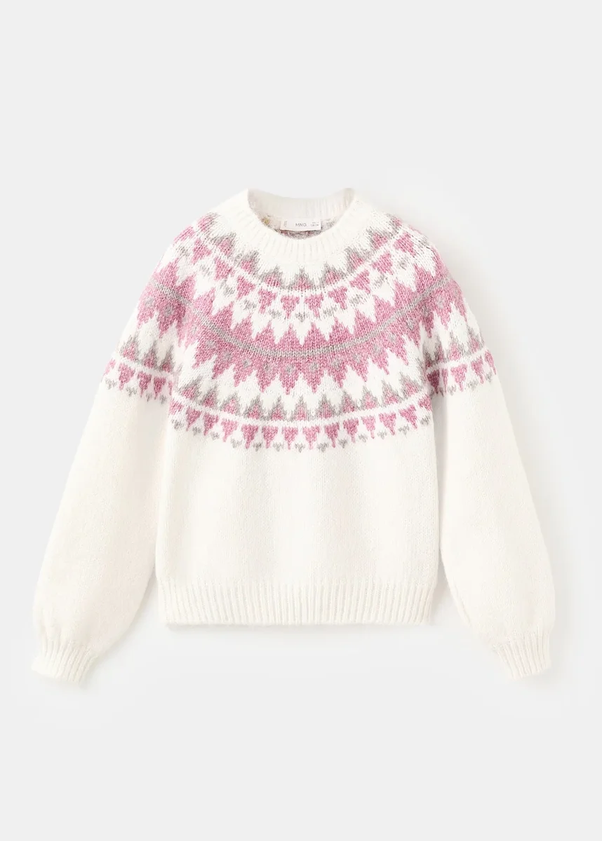 Pletená látka. Žakárový vzor. Rovný střih. Kulatý výstřih. Dlouhé rukávy. Žebrovaný výstřih, manžety a lem