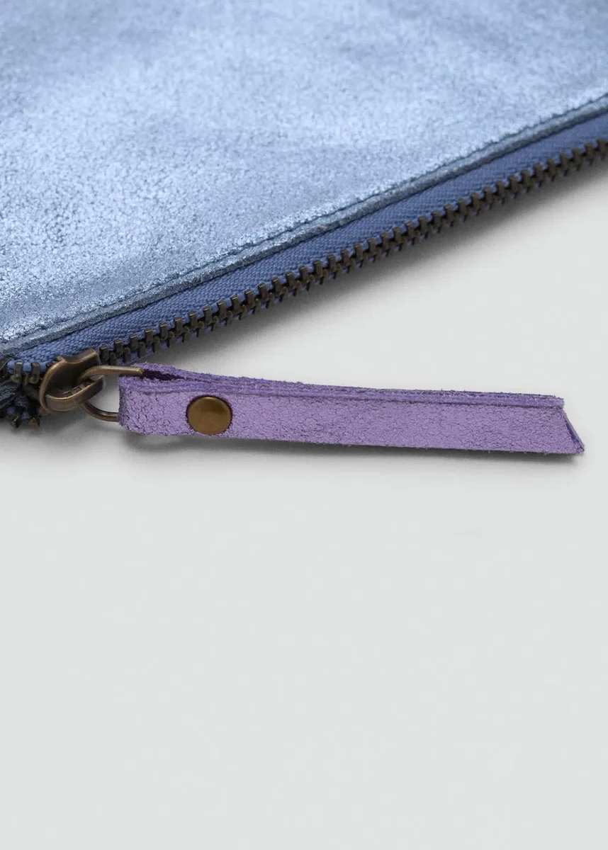 100 % hovězí kůže. Kovový vzhled. Čtvercový design. Zapínání na zip.