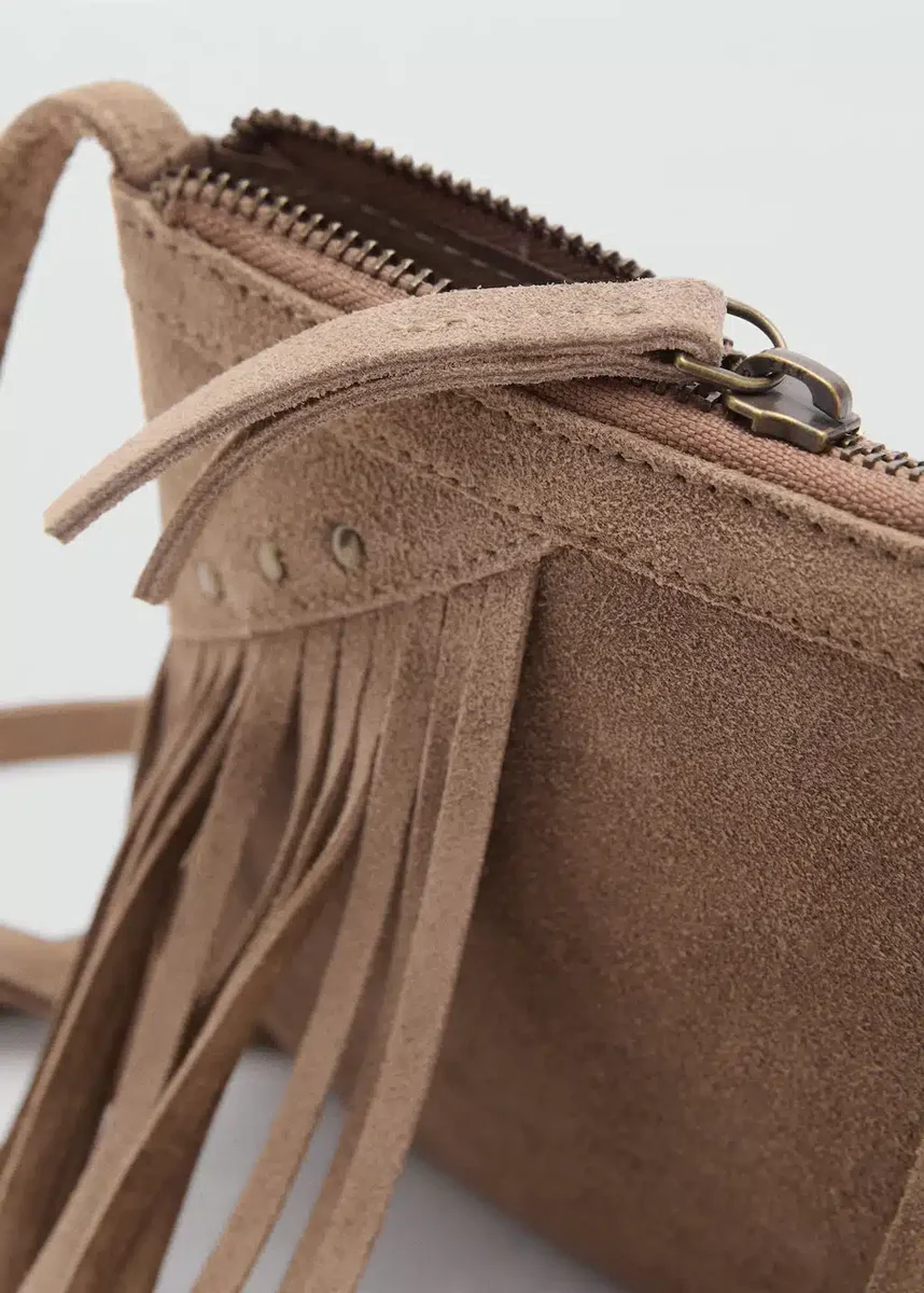 100% hovězí kůže. Semiš. Čtvercový design. Třásně. Zapínání na zip. Dlouhá rukojeť.