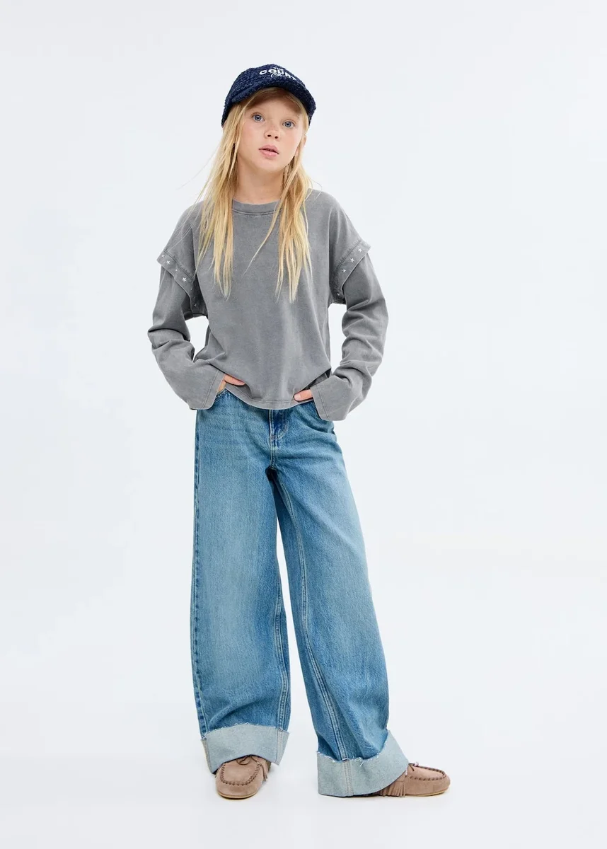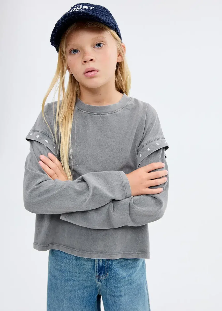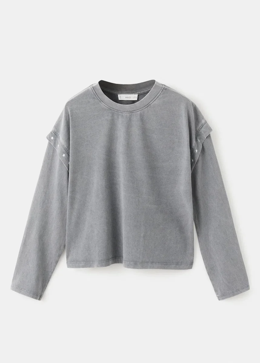 100 % bavlna. Kulatý výstřih. Dlouhé rukávy. Detail dvojitých rukávů. Kovové korálky. Detail hvězdiček. Black Friday.