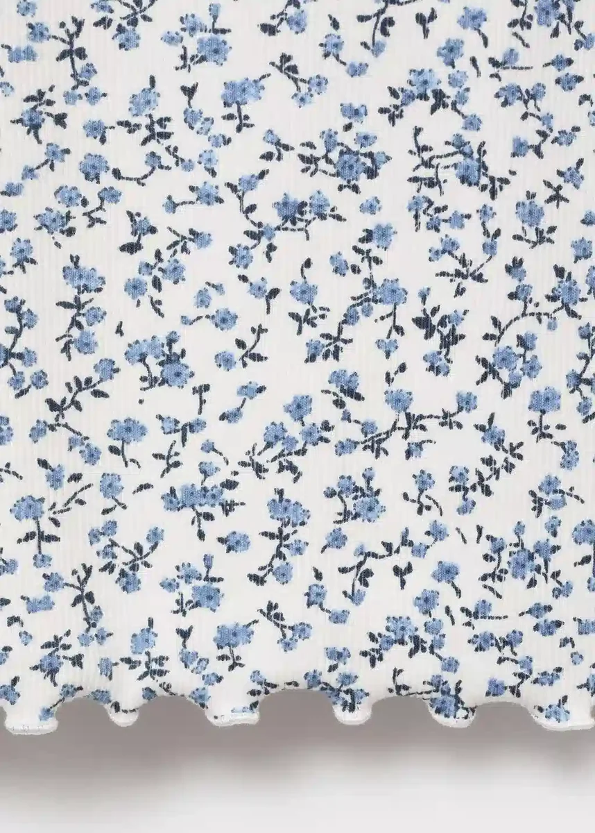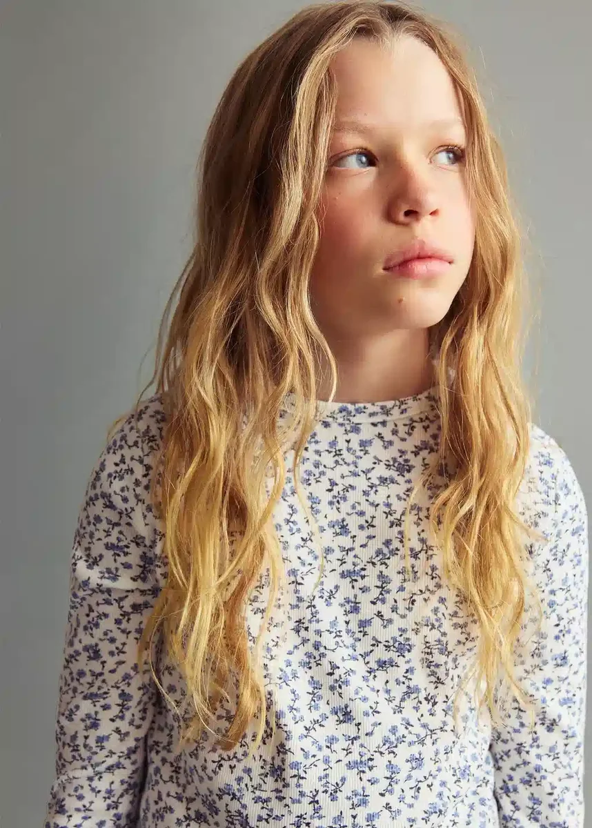 Bavlněná tkanina. Pružná tkanina. Žebrovaný design. Rovný střih. Květinový potisk. Kulatý výstřih. Dlouhý rukáv. Zvlněný lem