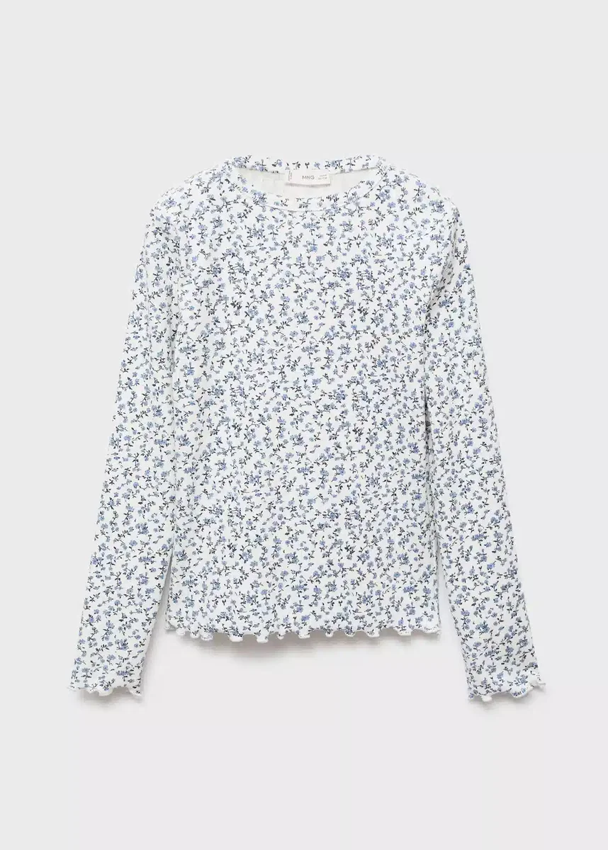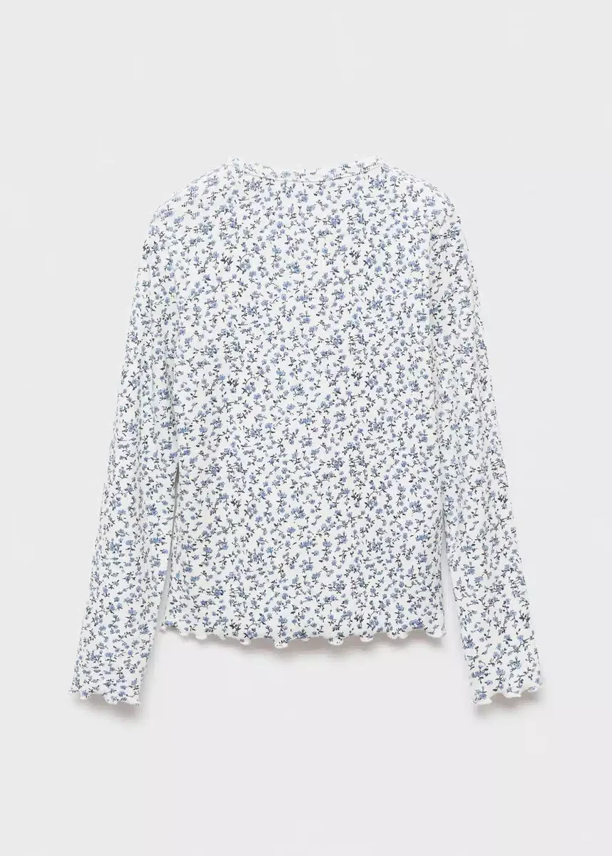 Bavlněná tkanina. Pružná tkanina. Žebrovaný design. Rovný střih. Květinový potisk. Kulatý výstřih. Dlouhé rukávy. Zvlněný lem