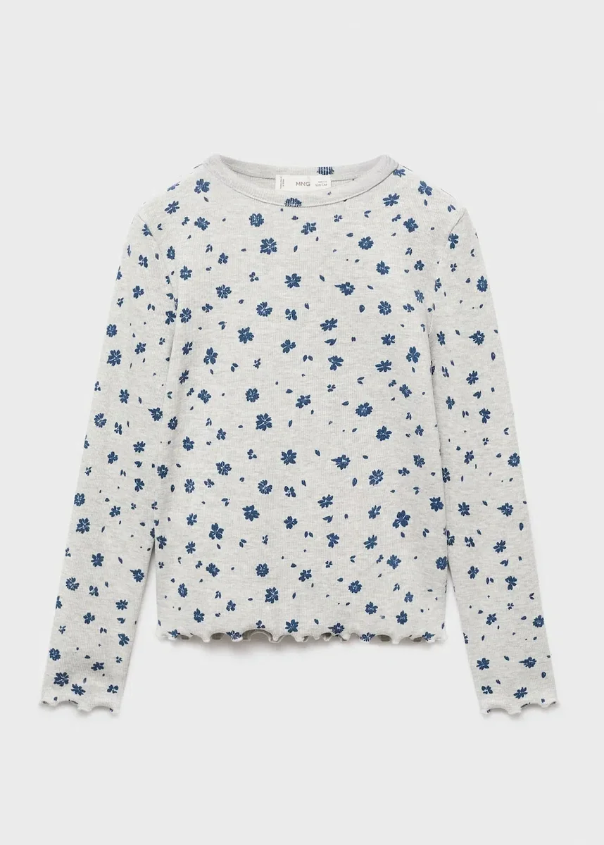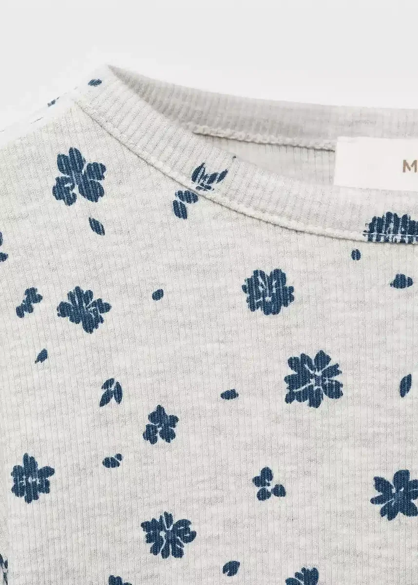 Bavlněná tkanina. Pružný materiál. Žebrovaný design. Rovný střih. Květinový potisk. Kulatý výstřih. Dlouhé rukávy. Zvlněný lem.