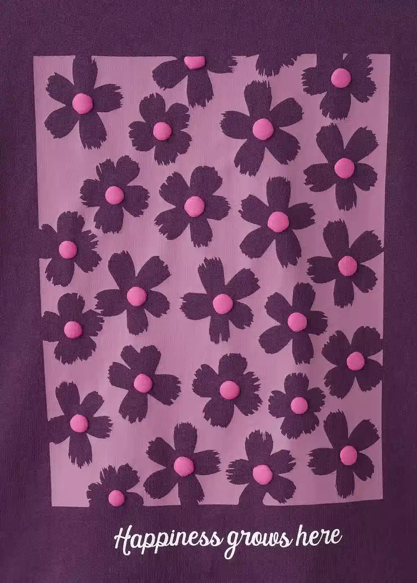 100% bavlna. Potisk. Květinový potisk. Kulatý výstřih. Dlouhé rukávy