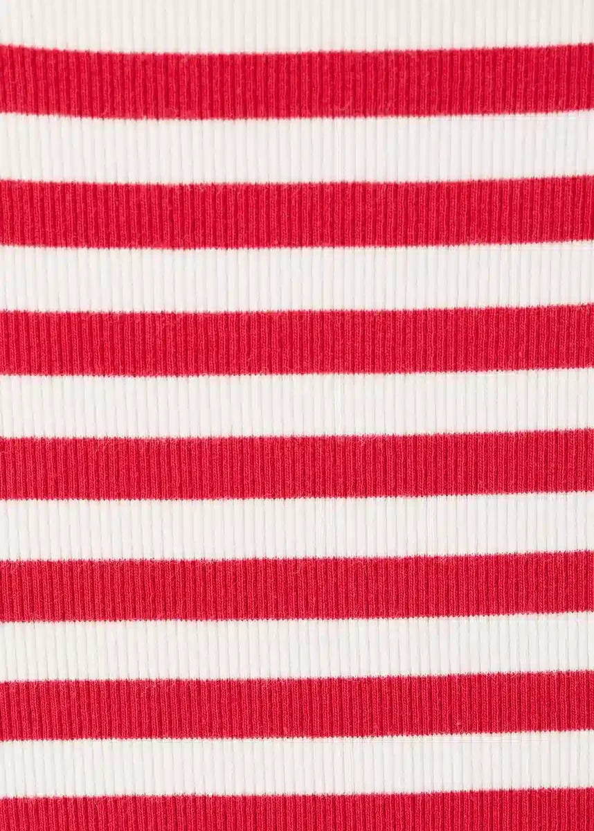 Bavlněná tkanina. Žebrovaný úplet. Pruhovaný design. Tenká ramínka. Celkový vzhled.