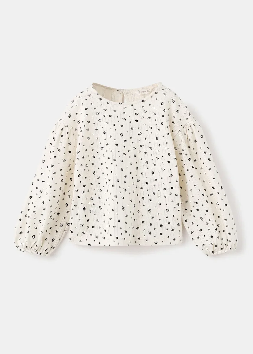 Toto tričko je vyrobeno ze 100% bavlny a má rovný střih s květinovým potiskem a žebrovanými detaily. Nafouklé rukávy a elastické manžety zajišťují pohodlí, zatímco zapínání na knoflíky na zadní straně zaručuje perfektní padnutí.