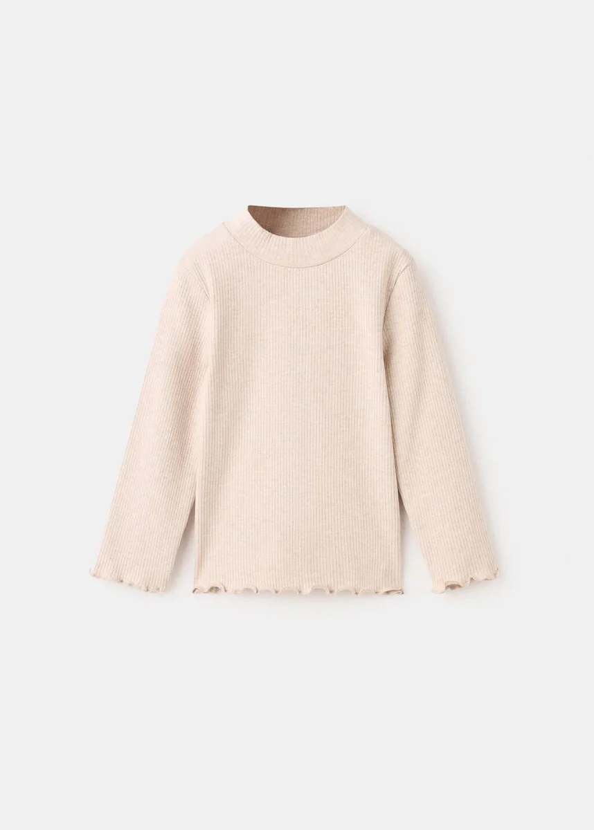 Bavlněná tkanina. Pružná tkanina. Žebrovaná pletenina. Rovný střih. Rolák. Dlouhý rukáv. Zvlněné okraje