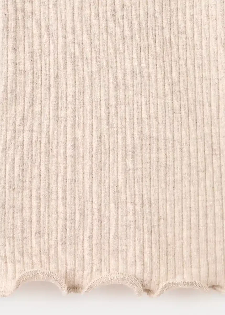 Bavlněná tkanina. Pružná tkanina. Žebrovaná pletenina. Rovný střih. Rolák. Dlouhé rukávy. Zvlněné okraje.