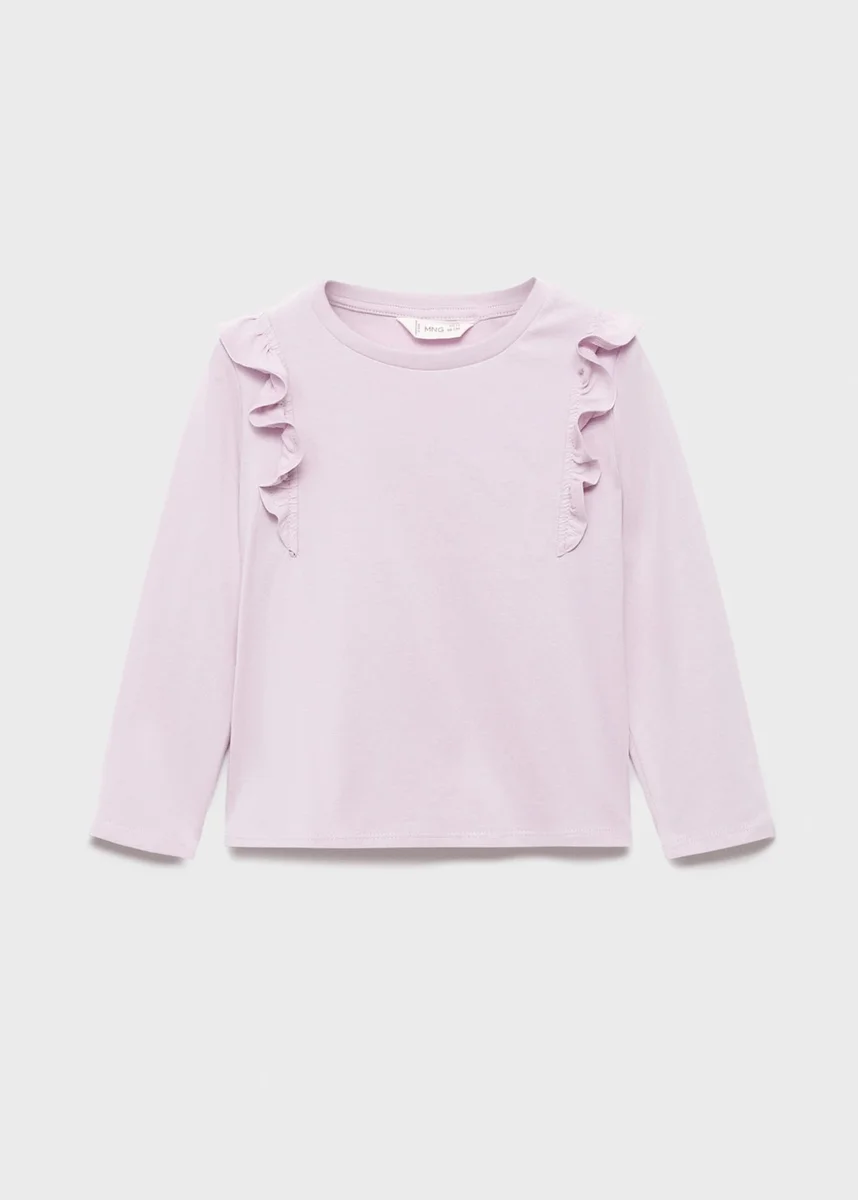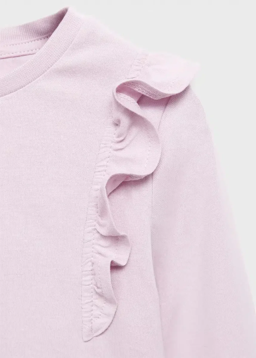 100 % bavlna. Rovný střih. Kulatý výstřih. Volánky na ramenou. Dlouhé rukávy