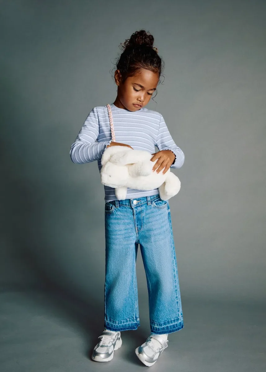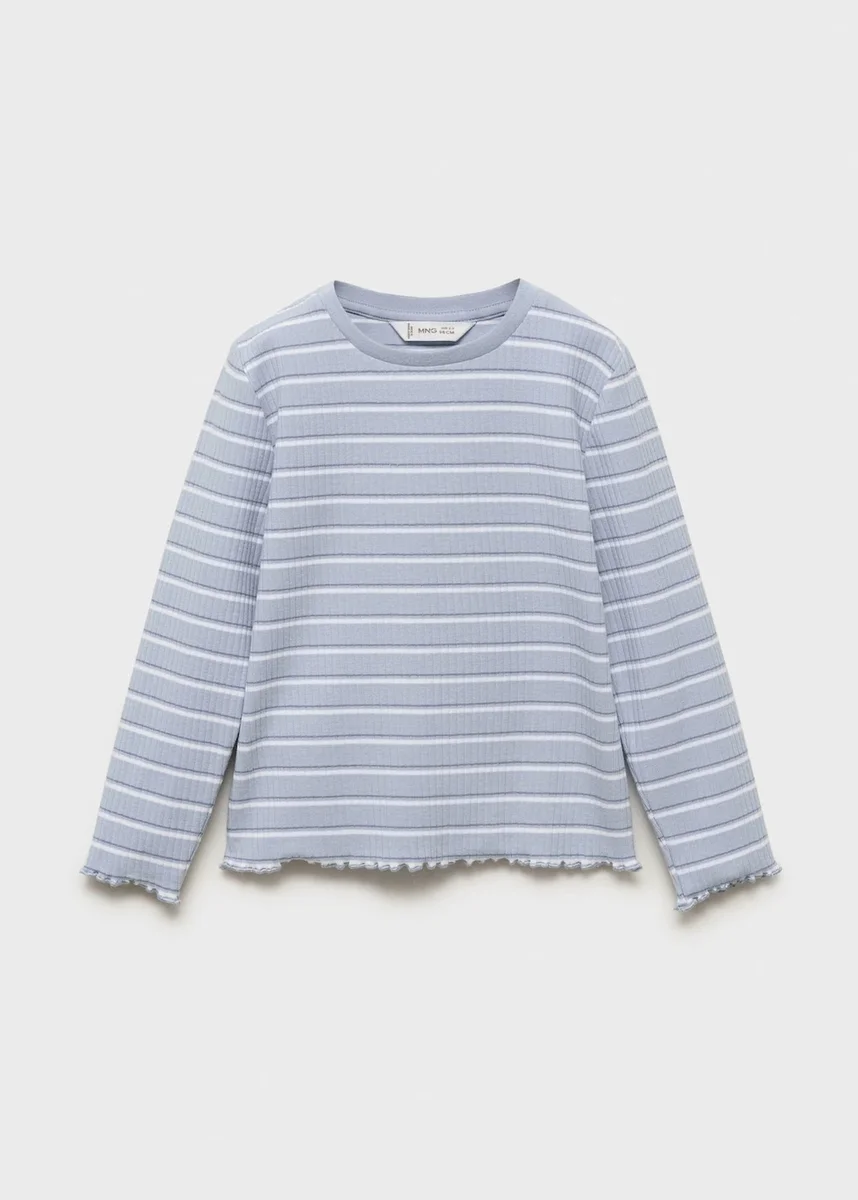 Tento oděv je vyroben z bavlněné směsi a má rovný střih s pruhovaným potiskem. Kulatý výstřih a dlouhé rukávy doplňují vroubkované lemy.