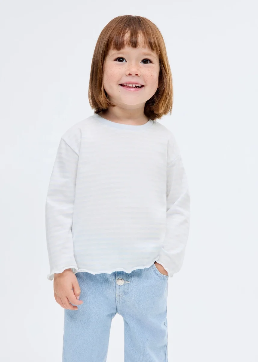 Tento oděv je vyroben ze 100% bavlny a má rovný střih s pruhy. Kontrastní kulatý výstřih mu dodává osobitý vzhled, zatímco dlouhé rukávy dotvářejí jeho styl.