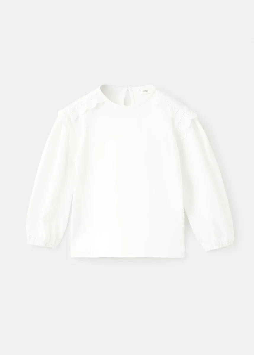 Tento model s kulatým výstřihem a dlouhými rukávy má rovný střih a je vyroben ze 100% bavlny. Dlouhé rukávy mají elastické manžety a anglické vyšívané krajkové detaily. Zapínání na knoflíky na zadní straně