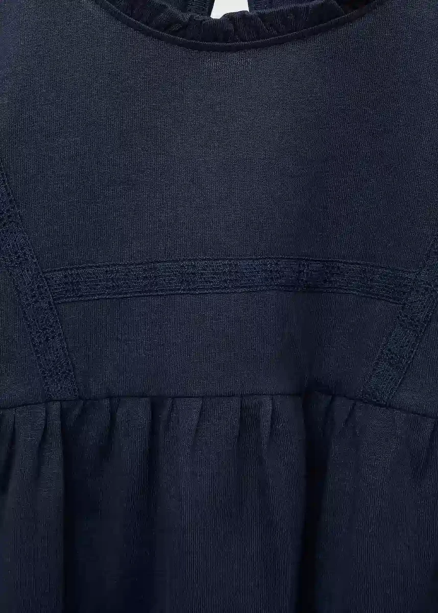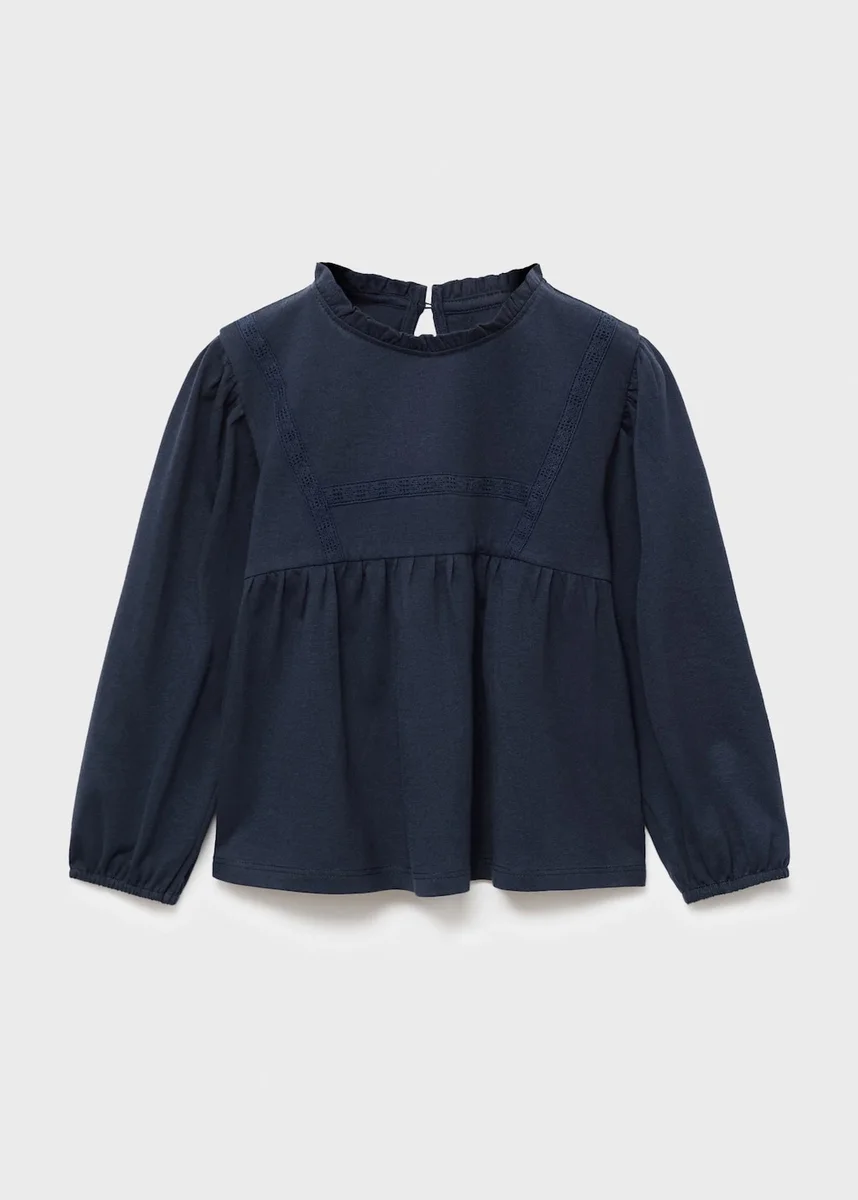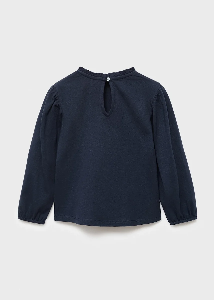 Tento oděv je vyroben ze 100% bavlny a má rovný střih se shromážděným kulatým výstřihem. Dlouhé rukávy mají elastické manžety a zapínání na zadní straně. Shromážděný detail na lemu a výšivka na přední straně.