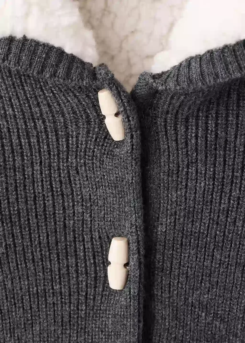 Pletená látka. Rovný střih. S kapucí. Malé uši na kapuci. Dlouhé rukávy. Vnitřek z umělé ovčí kůže. Zapínání na knoflíky. Dvě boční kapsy