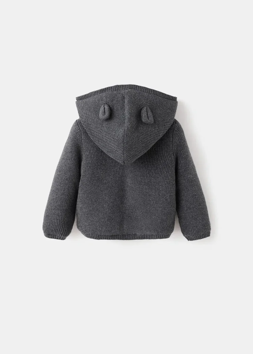 Pletená látka. Rovný střih. S kapucí. Malé uši na kapuci. Dlouhé rukávy. Vnitřek z umělé ovčí kůže. Zapínání na knoflíky. Dvě boční kapsy.