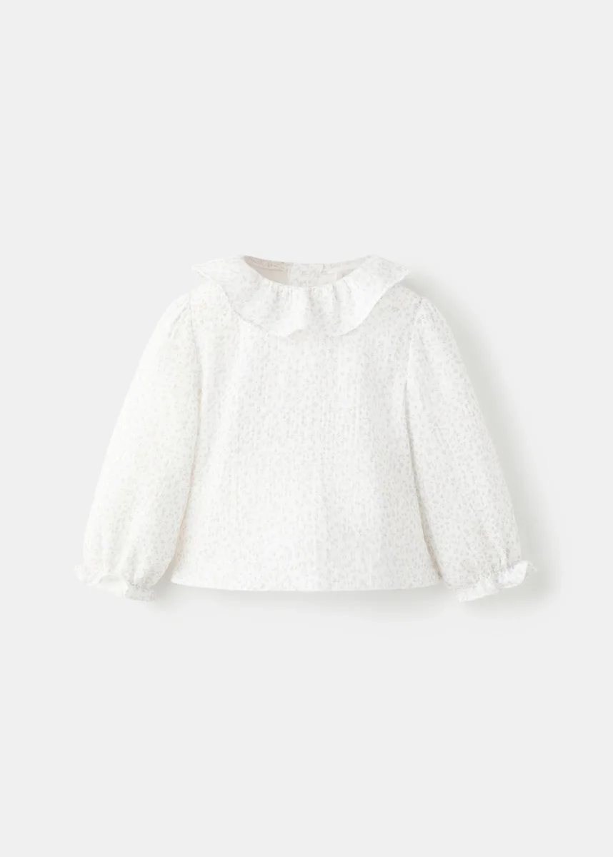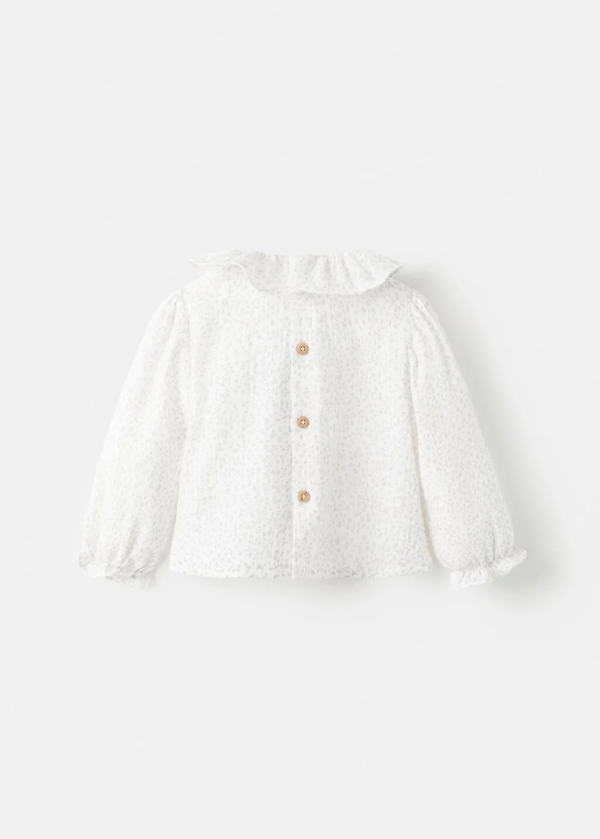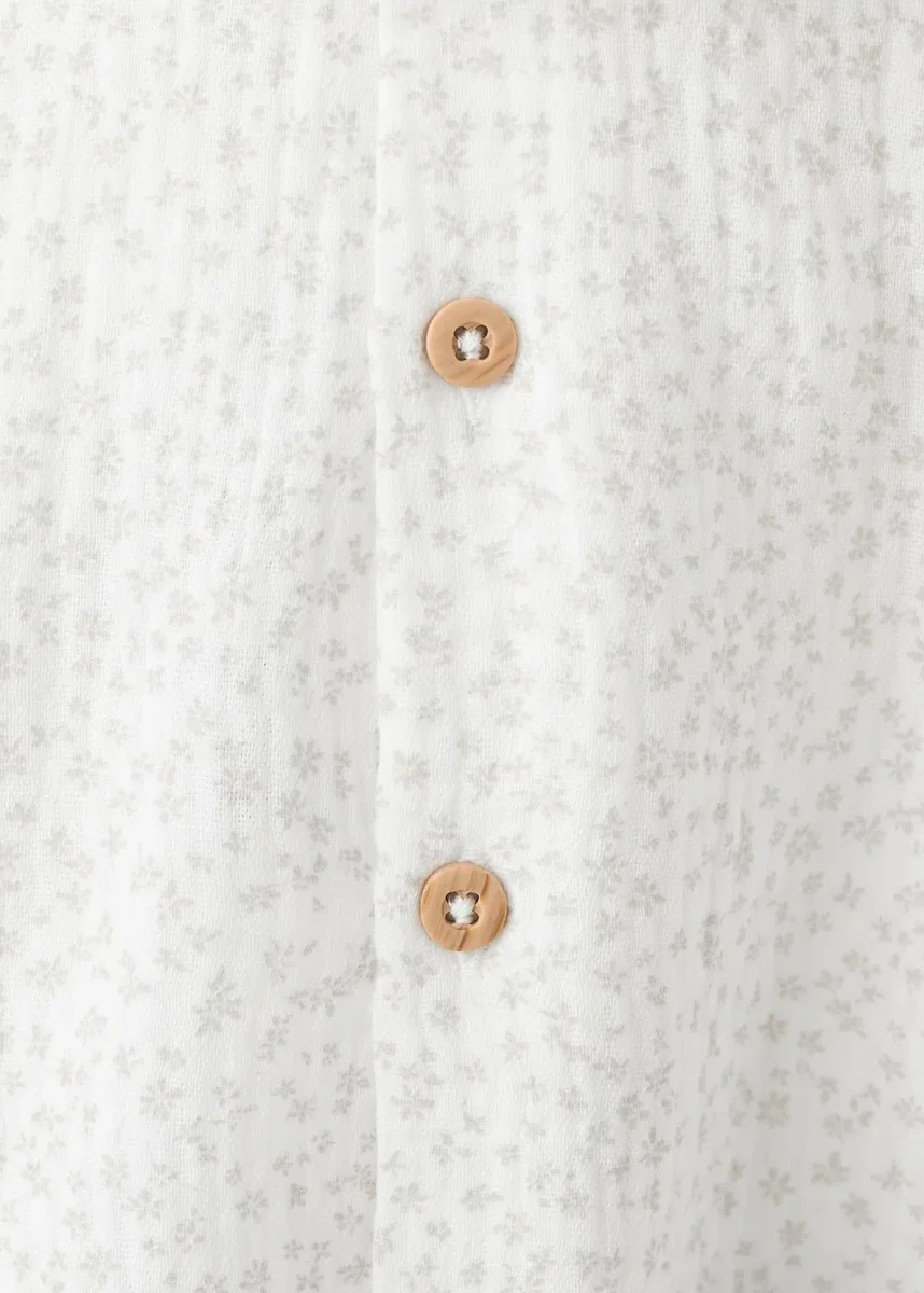100% bavlna. Bambula. Květinový vzor. Límec Peter Pan. Zapínání na knoflíky vzadu. Dlouhé rukávy s žebrovanými lemy.