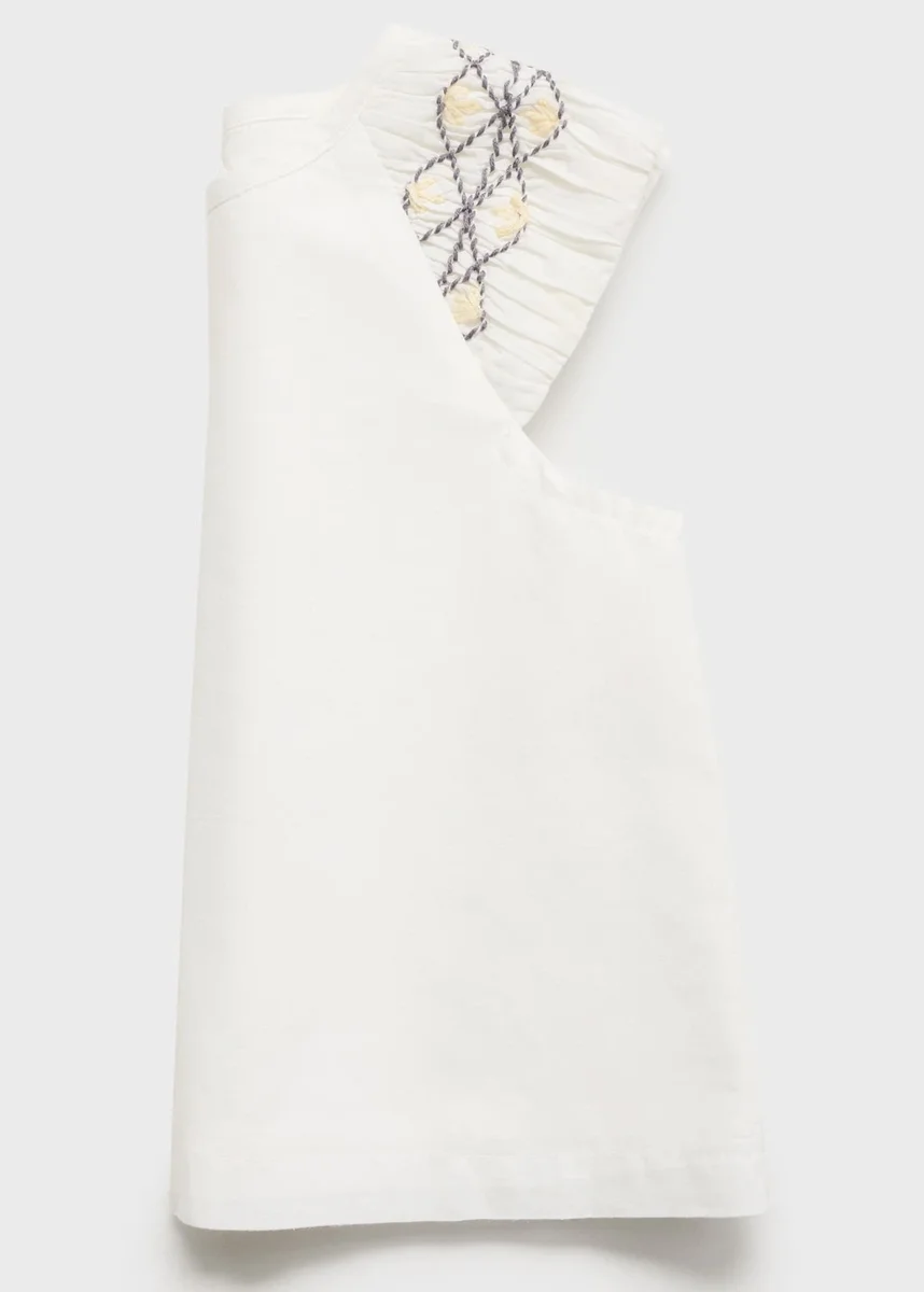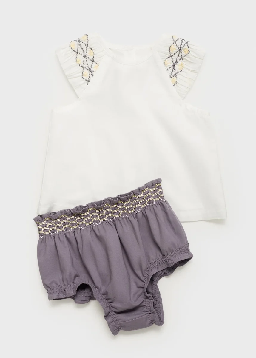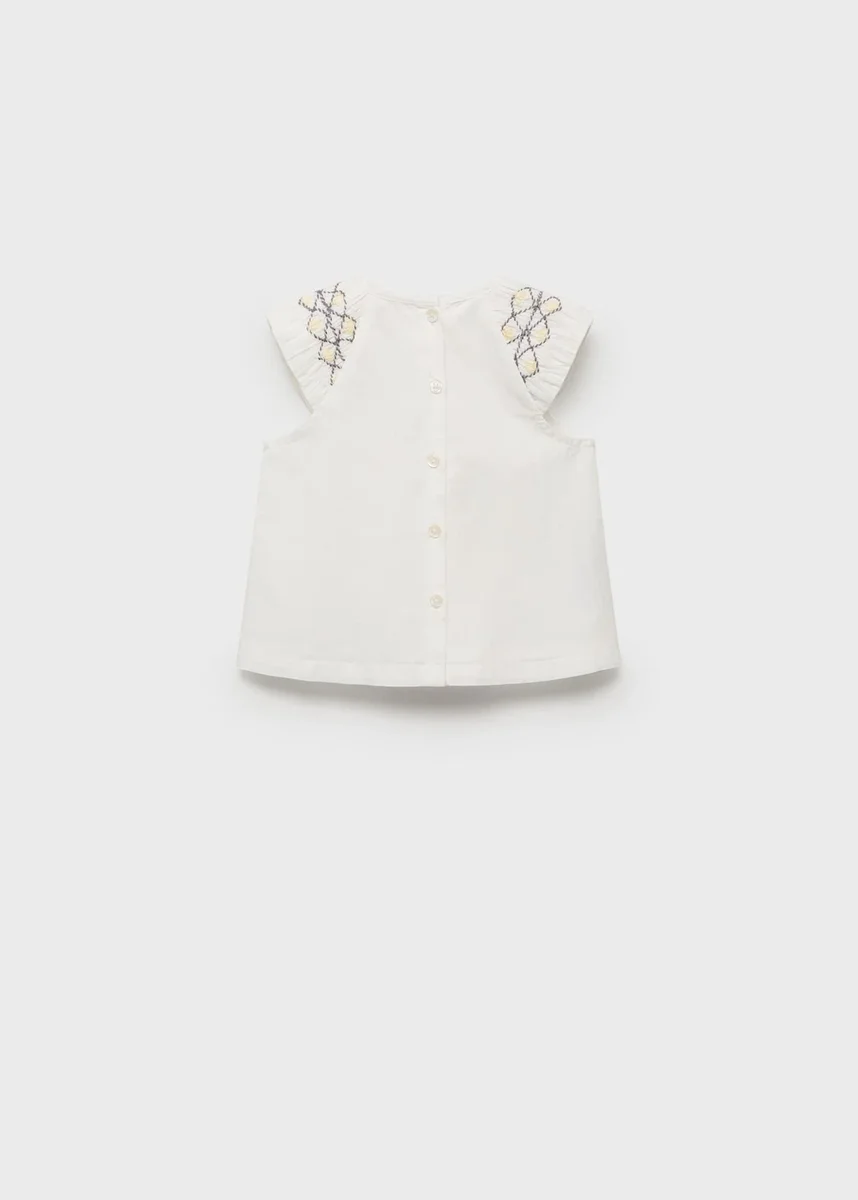 100 % bavlna. Střih do A. Šle s volánky a výšivkou. Kulatý výstřih. Zapínání na knoflíky vzadu. Sada