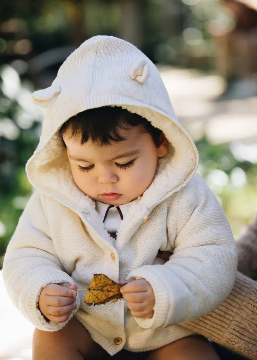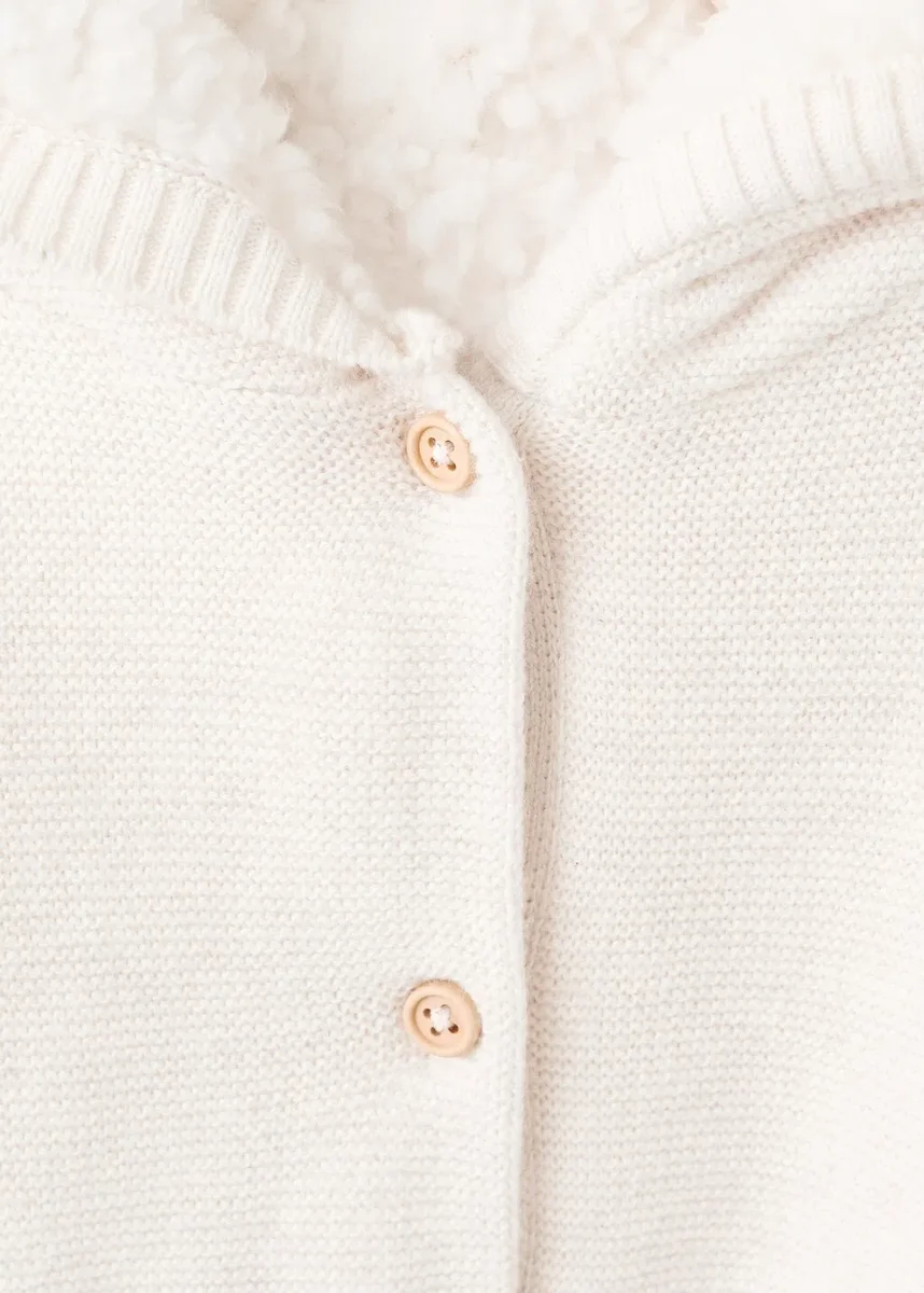 Pletená látka. Směs bavlny. Vnitřek z umělé ovčí kůže. Rovný střih. Malé uši na kapuci. Dlouhé rukávy. Zapínání na knoflíky vpředu. Vánoční kolekce.
