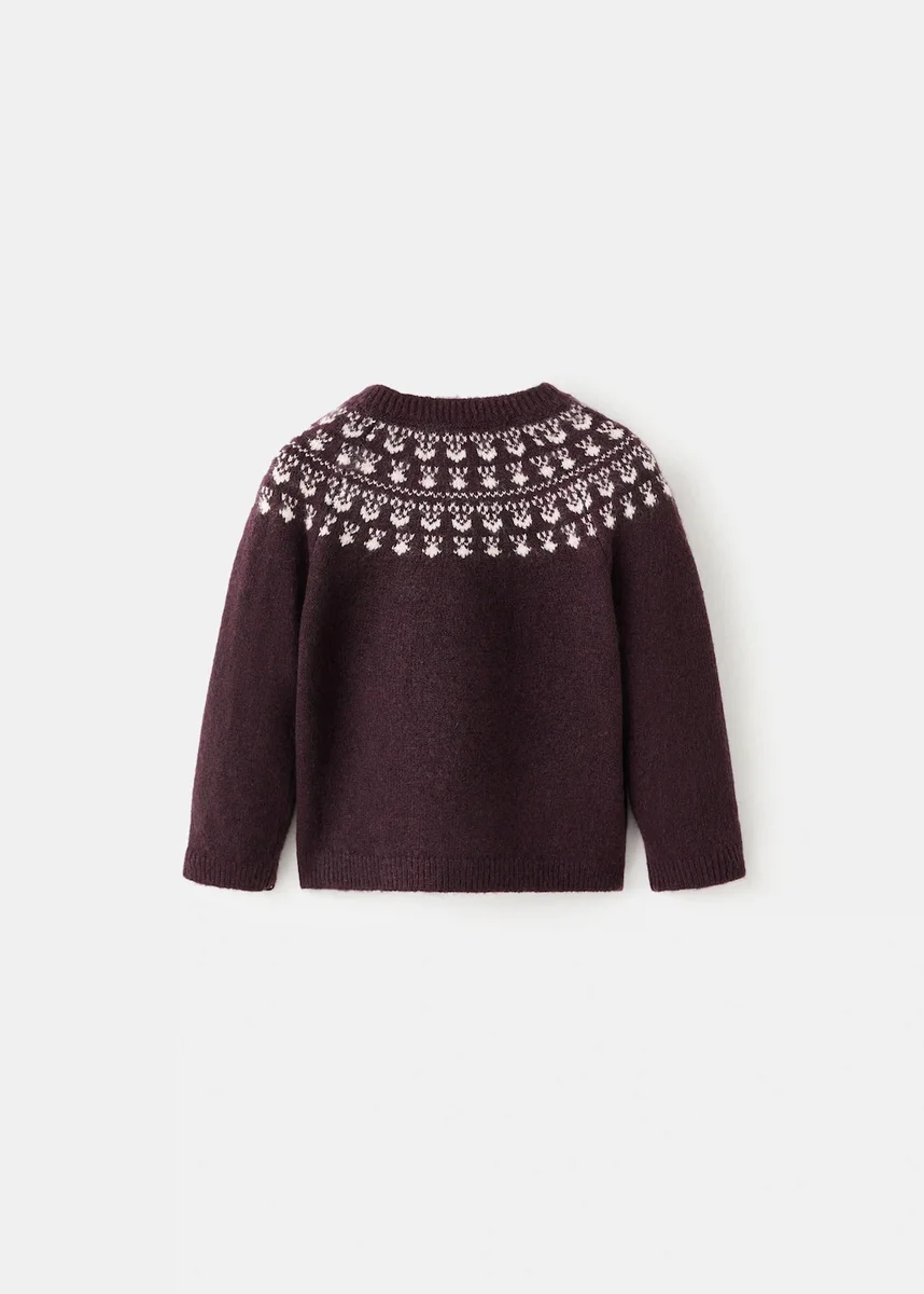 Pletená látka. Žakárový vzor. Kulatý výstřih. Dlouhé rukávy. Zapínání na knoflíky vpředu. Vánoční kolekce.