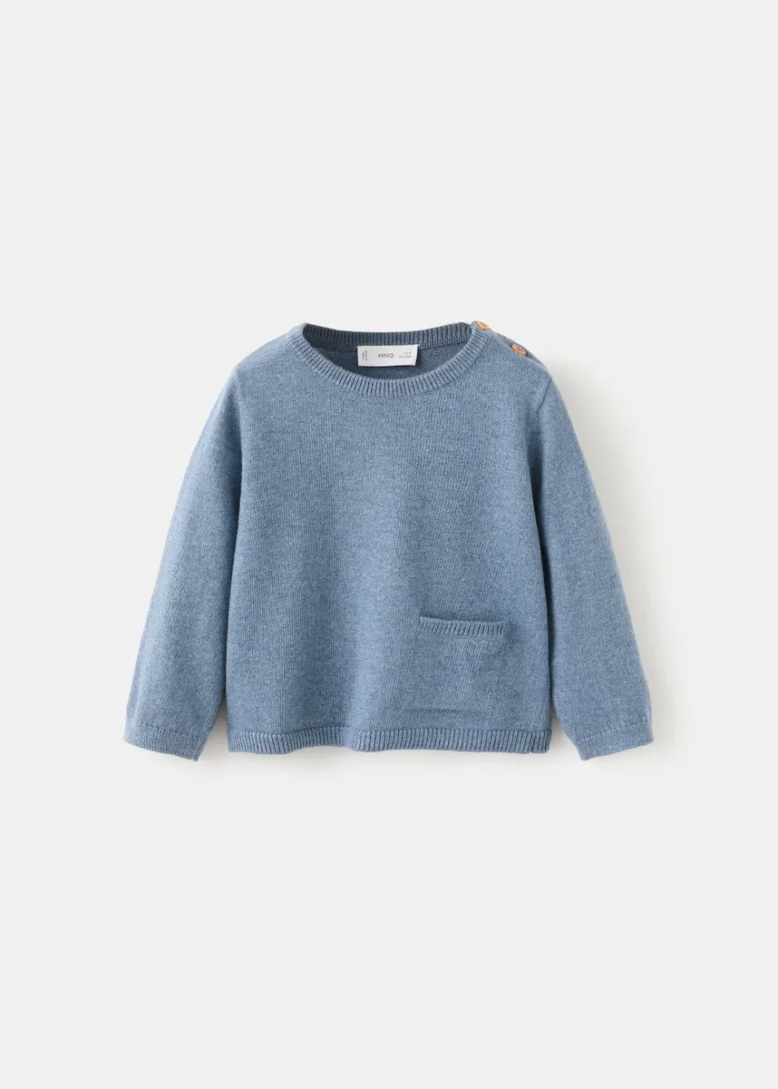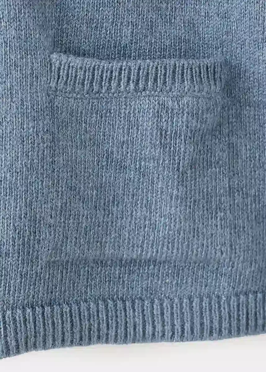 Pletená látka. Bavlněná látka. Rovný střih. Zaoblený výstřih se zapínáním na knoflíky. Dlouhé rukávy. Nášivková kapsa vpředu. Žebrované lemy.