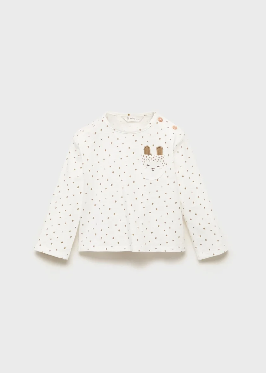 Toto tričko je vyrobeno ze 100% bavlny a má rovný střih s potiskem koťátka. Má kulatý výstřih s knoflíkovým zapínáním, dlouhé rukávy, vyšívané detaily a náprsní kapsu.