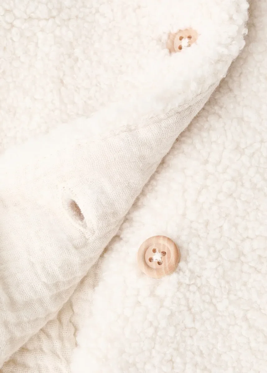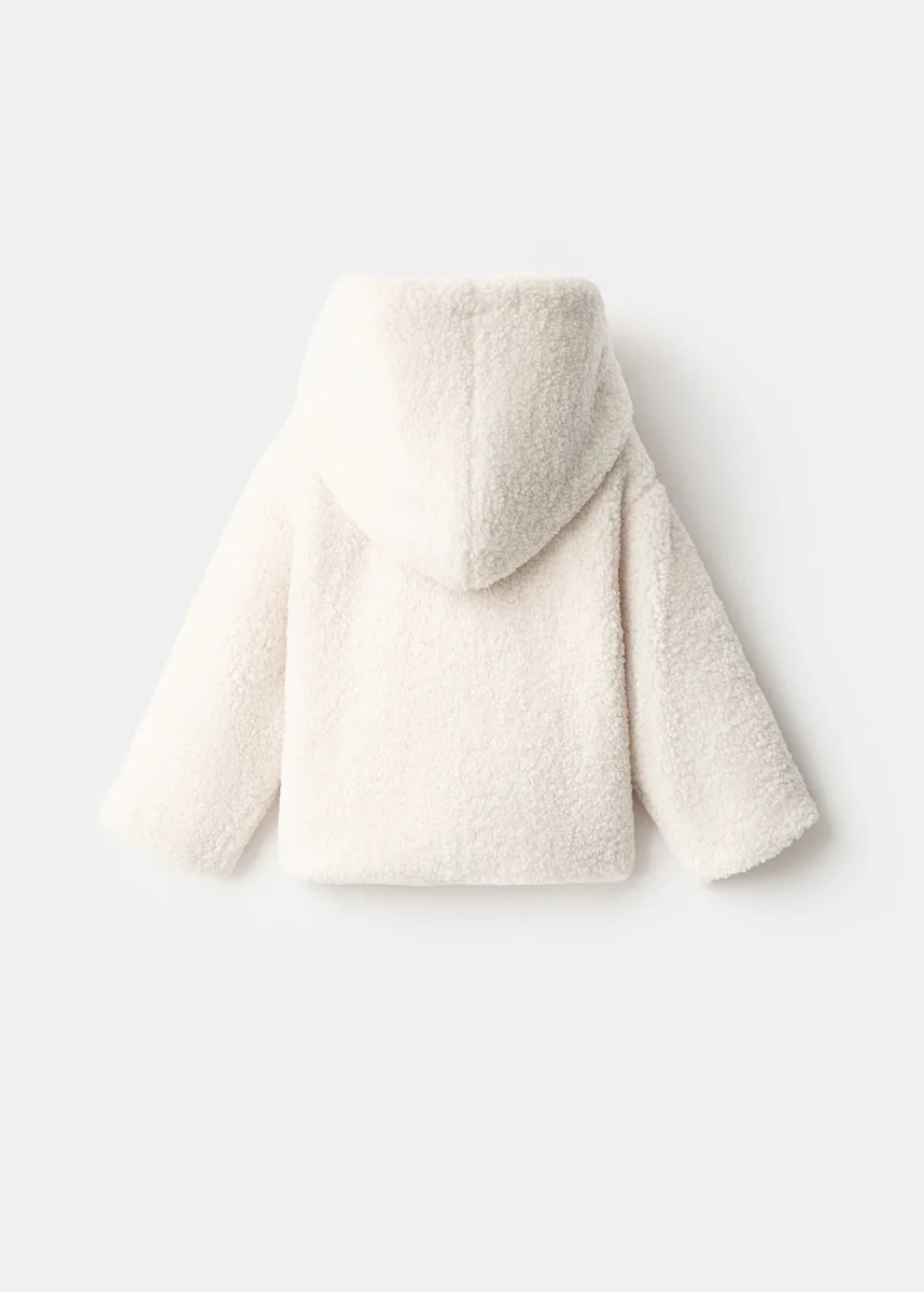 Materiál sherpa. Vnitřní materiál z tenké bavlněné tkaniny. Rovný střih. S kapucí. Dlouhé rukávy. Zapínání na knoflíky vpředu. Knoflíky s dřevěným efektem. Dvě boční kapsy. Vánoční kolekce