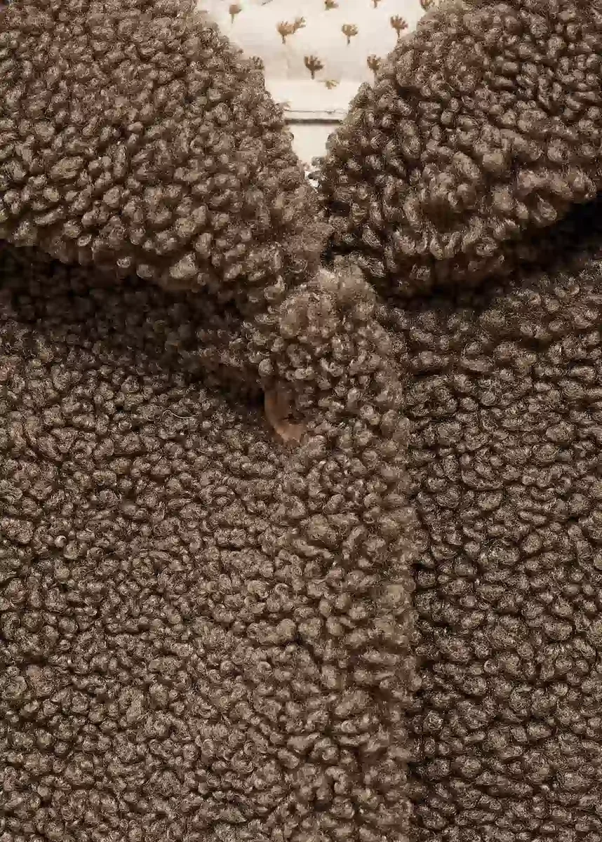 Materiál sherpa. Rovný střih. Malé uši na kapuci. Vnitřní bavlněná podšívka. Potisknutá podšívka. Dlouhé rukávy. Zapínání na knoflíky vpředu. Dvě boční kapsy. Vánoční kolekce