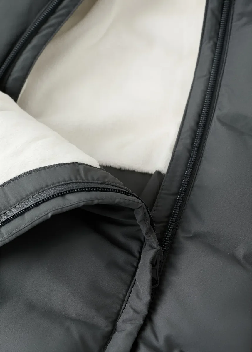 Prošívaná látka. Dlouhý střih. Kapuce s detailem ze syntetických chlupů. Zapínání na zip vpředu. Dlouhé rukávy. Vnitřní podšívka z polar fleece. Black Friday.