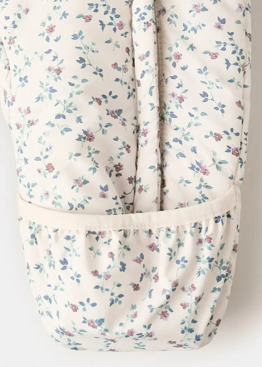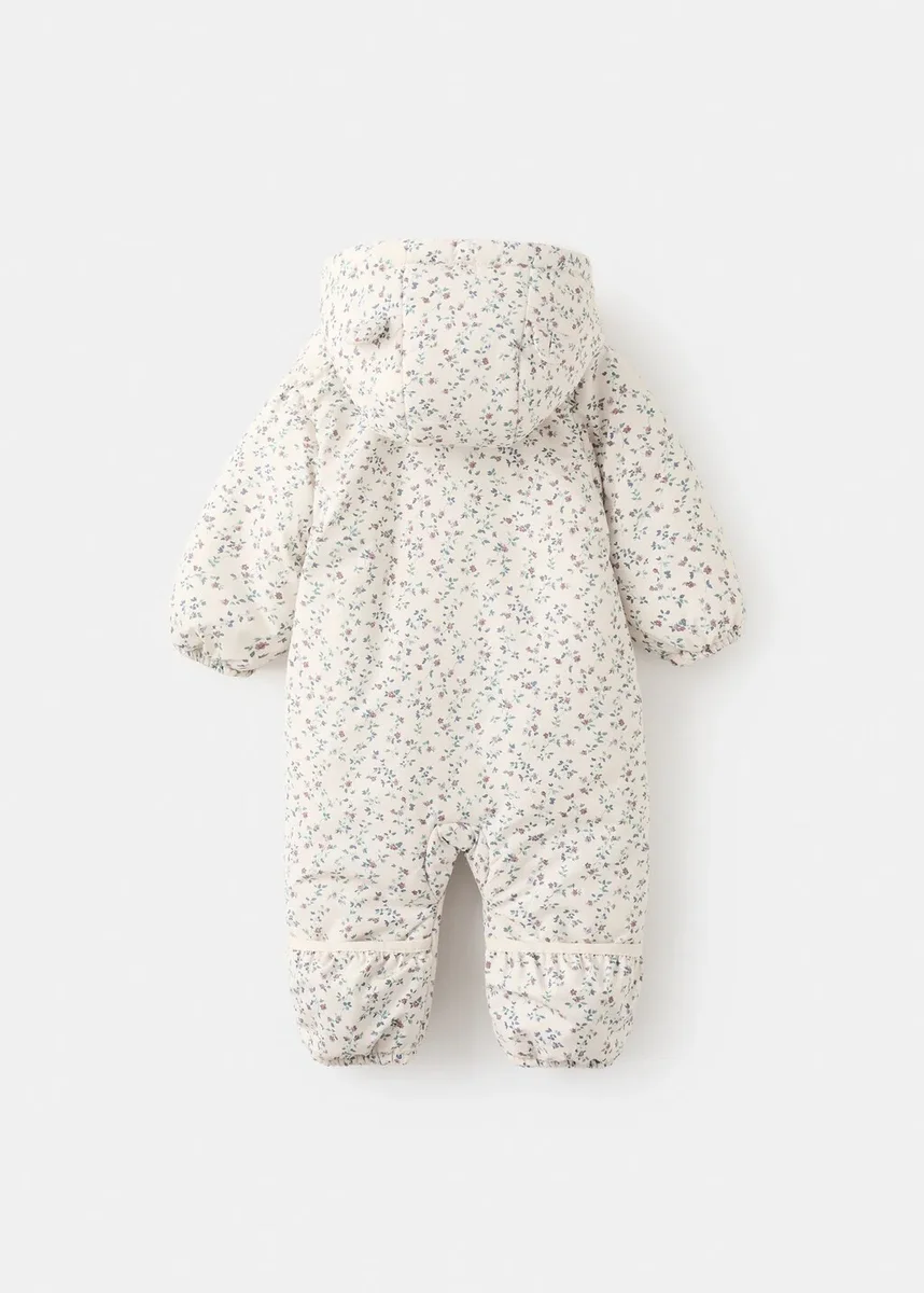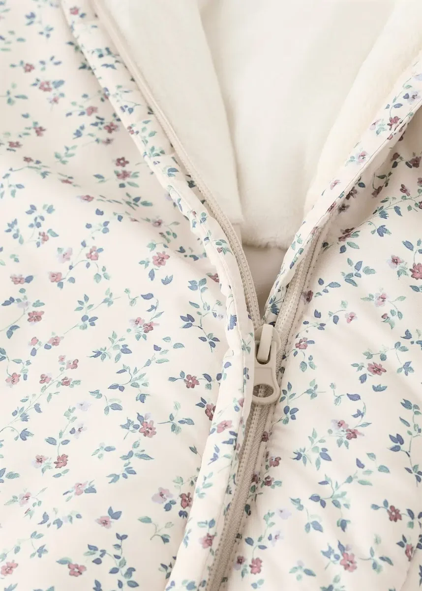 Prošívaná látka. Květinový vzor. Kapuce s detailem ze syntetických chlupů. Vnitřní podšívka z polar fleece. Zapínání na zip vpředu.