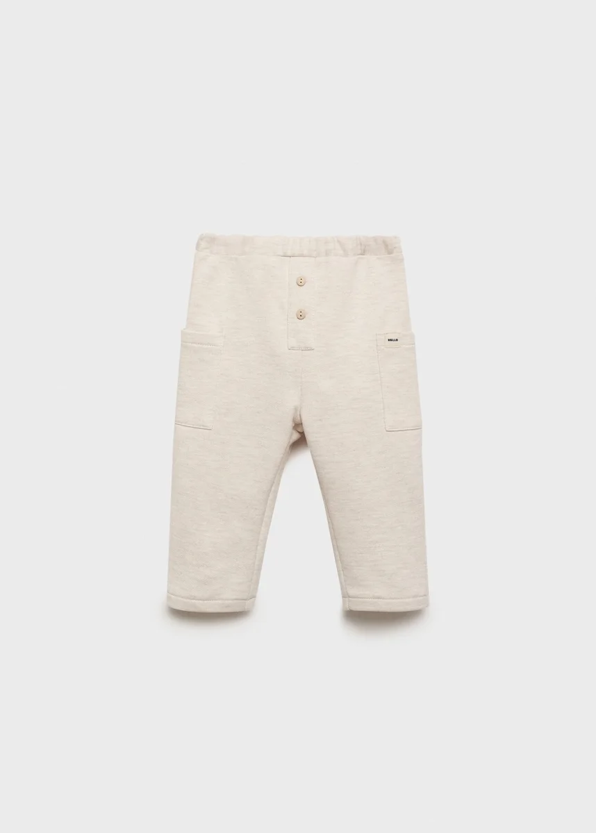 Bavlněná tkanina. Polyesterová tkanina. Dlouhý střih. Joggingový střih. Cargo střih. Elastický pas. Ozdobné knoflíky.