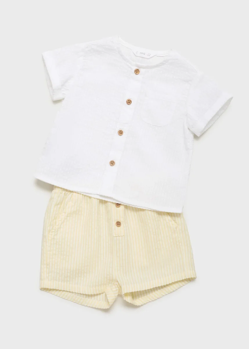 100% bavlna. Texturovaná tkanina. Jednoduchý design. Rovný střih. Kulatý výstřih. Krátké rukávy. Zapínání na knoflíky. Nášivková kapsa na přední straně. Sada