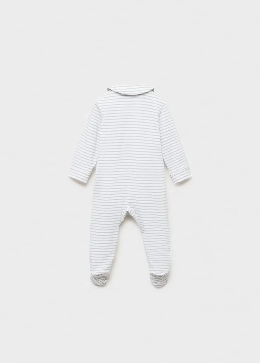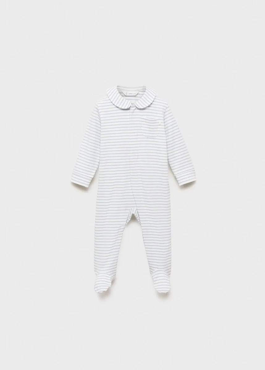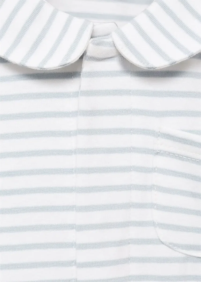 Bavlněná tkanina. Dlouhý střih. Pruhovaný vzor. Límec Peter Pan. Dlouhé rukávy. S botkami. Zapínání na patentky