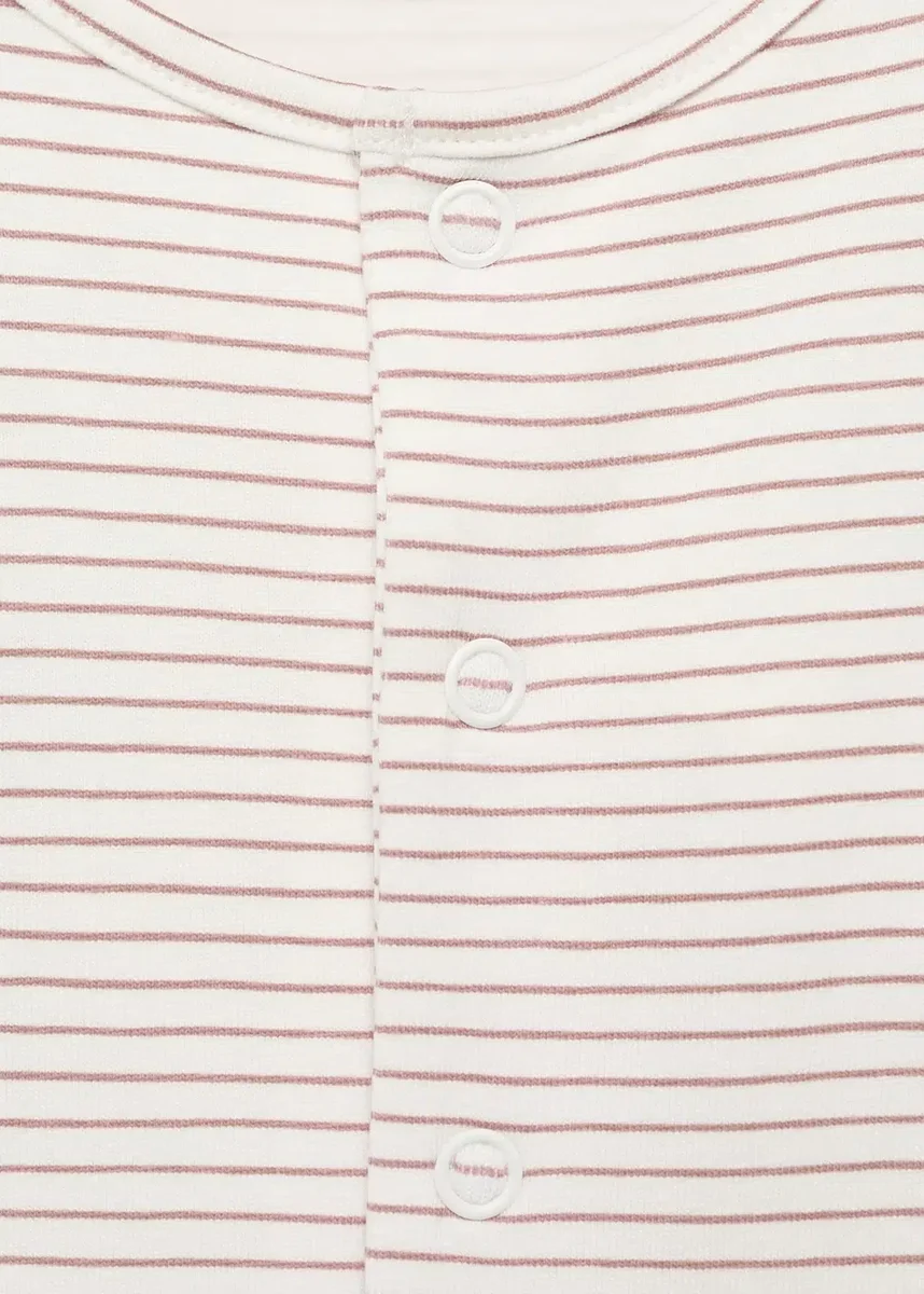 Bavlněná tkanina. Rovný střih. Krátký střih. Pruhovaný vzor. Kulatý výstřih. Krátké rukávy. Zapínání na knoflíky vpředu.