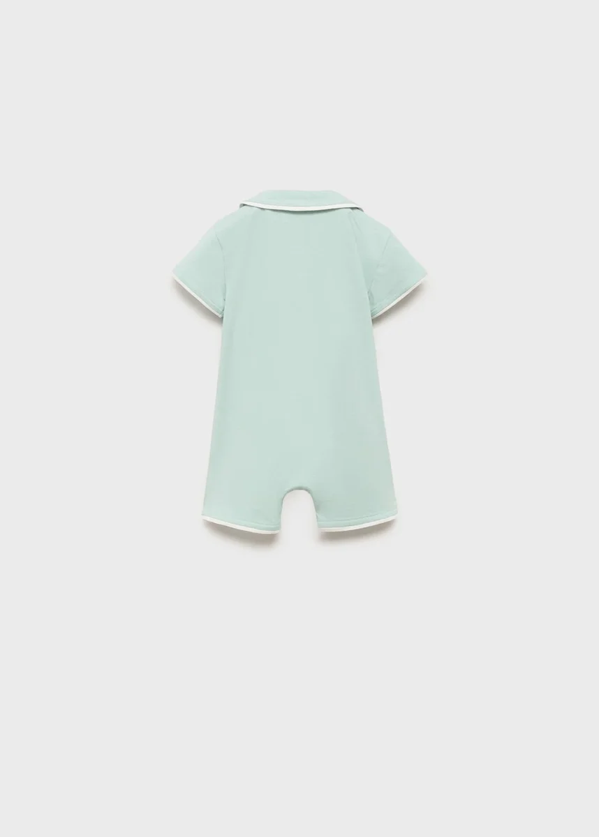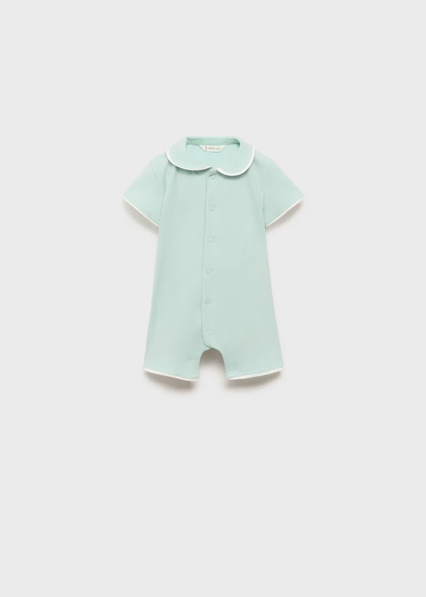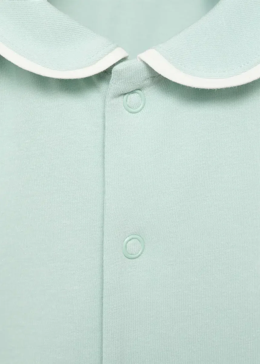 Bavlněná tkanina. Krátký střih. Rovný střih. Babydoll límec. Krátké rukávy. Zapínání na knoflíky vpředu. Zapínání na patentky. Kontrastní lemování.