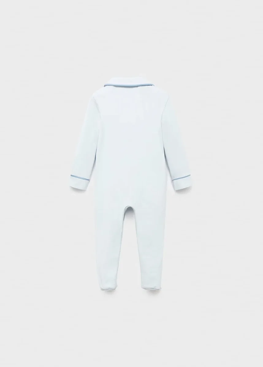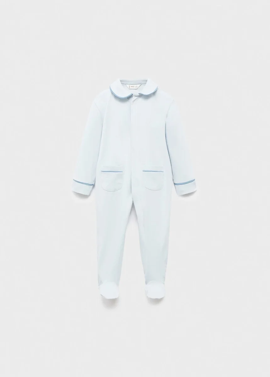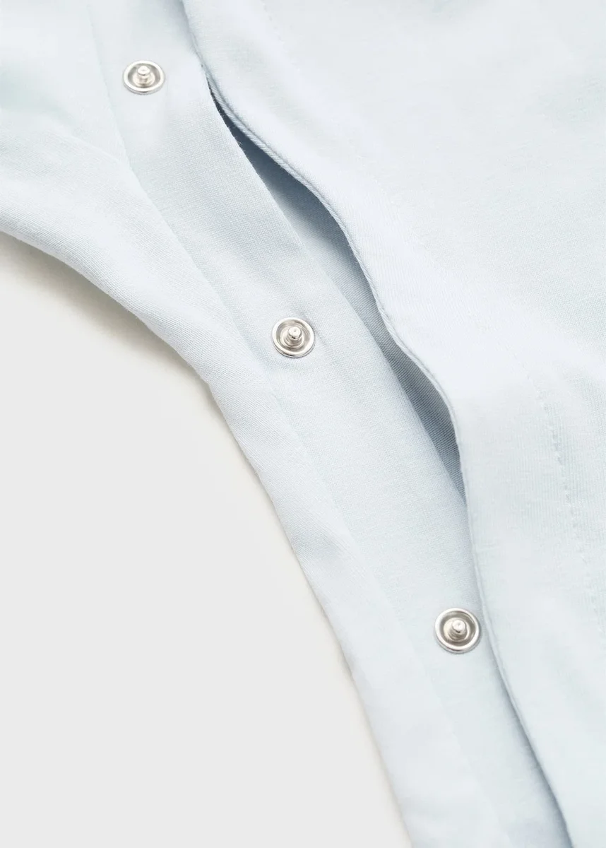 Bavlněná tkanina. Pružná tkanina. Dlouhý střih. Rovný střih. Límec Peter Pan. Dlouhé rukávy. Dvě přední kapsy. Zapínání na knoflíky vpředu. Lemování.