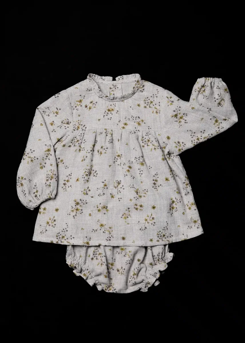 100 % bavlna. Střih do A. Květinový potisk. Rolákový výstřih. Dlouhé rukávy s žebrovanými lemy. Nařasené detaily vpředu. Zapínání na knoflíky vzadu. Vánoční kolekce