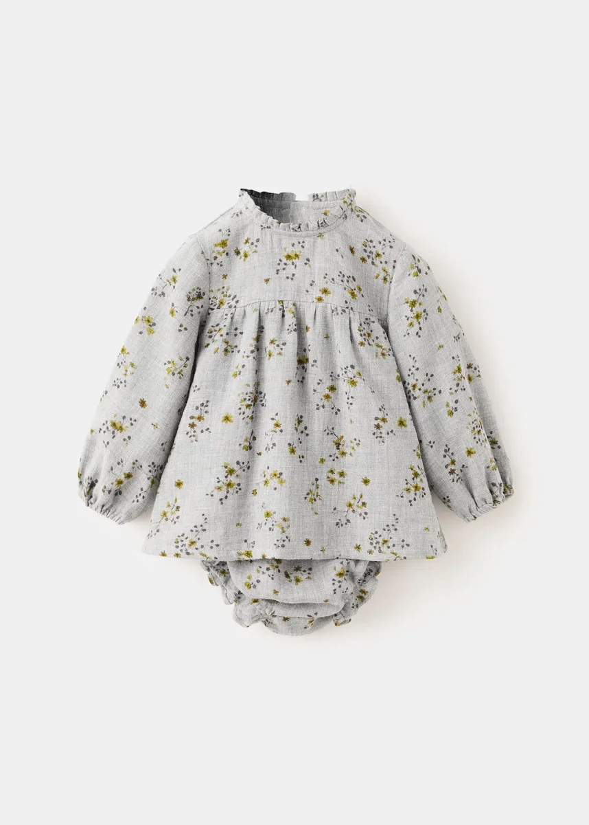 100% bavlna. Střih do A. Květinový potisk. Nařasený kulatý výstřih. Dlouhé rukávy s žebrovanými lemy. Nařasený detail vpředu. Zapínání na knoflíky vzadu. Vánoční kolekce.