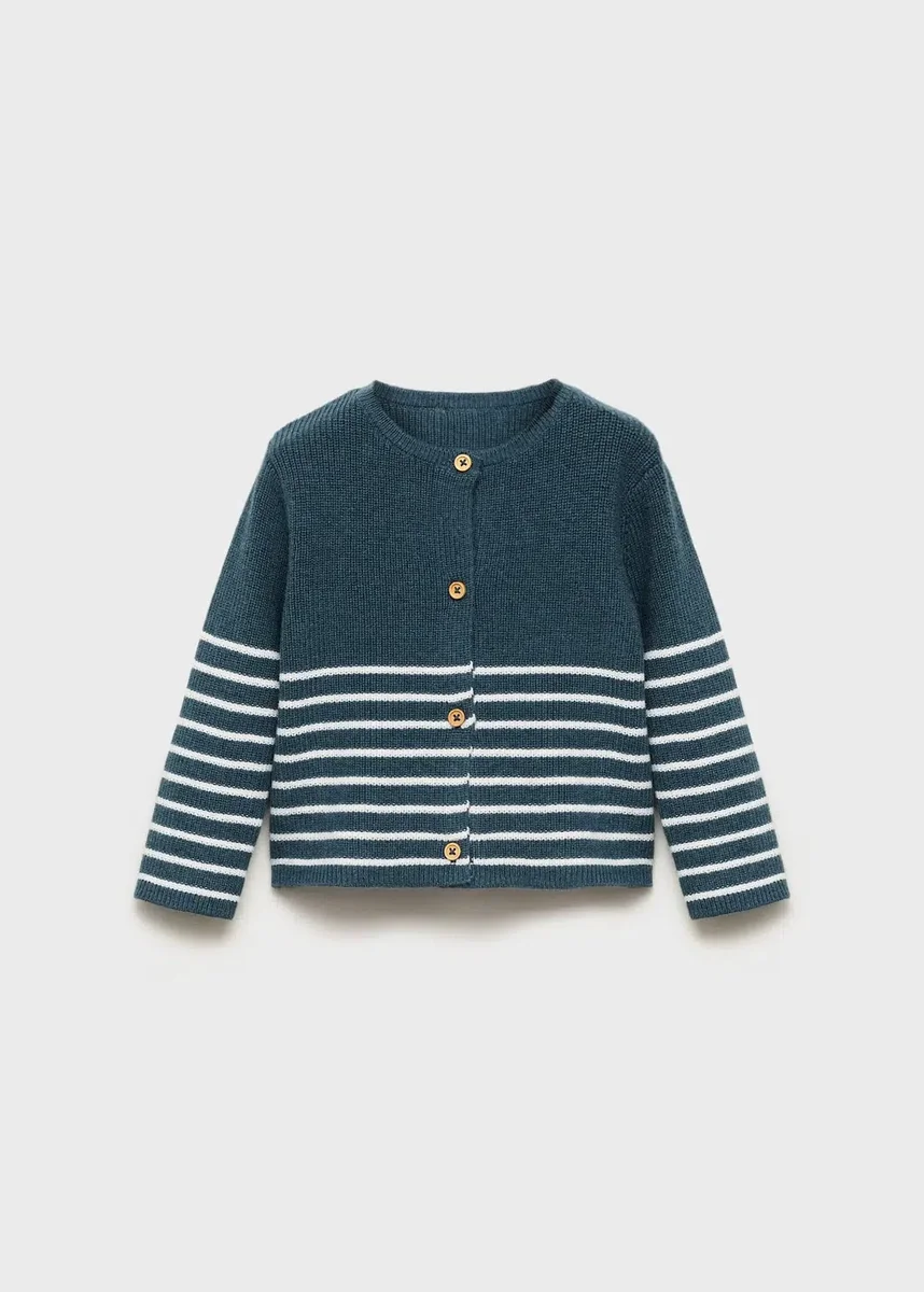 Bavlněná směsová tkanina. Pletená tkanina. Pruhovaný střih. Rovný střih. Kulatý výstřih. Dlouhé rukávy. Zapínání na knoflíky vpředu. Kontrastní knoflíky.