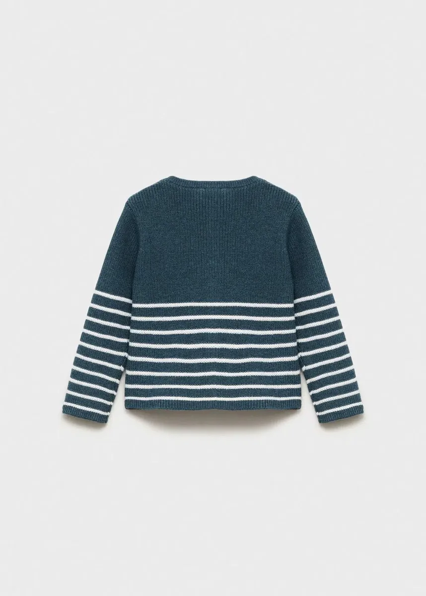 Bavlněná směsová tkanina. Pletená tkanina. Pruhovaný vzor. Rovný střih. Kulatý výstřih. Dlouhé rukávy. Zapínání na knoflíky vpředu. Kontrastní knoflíky