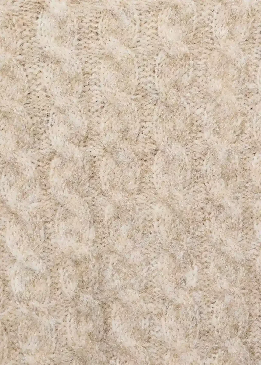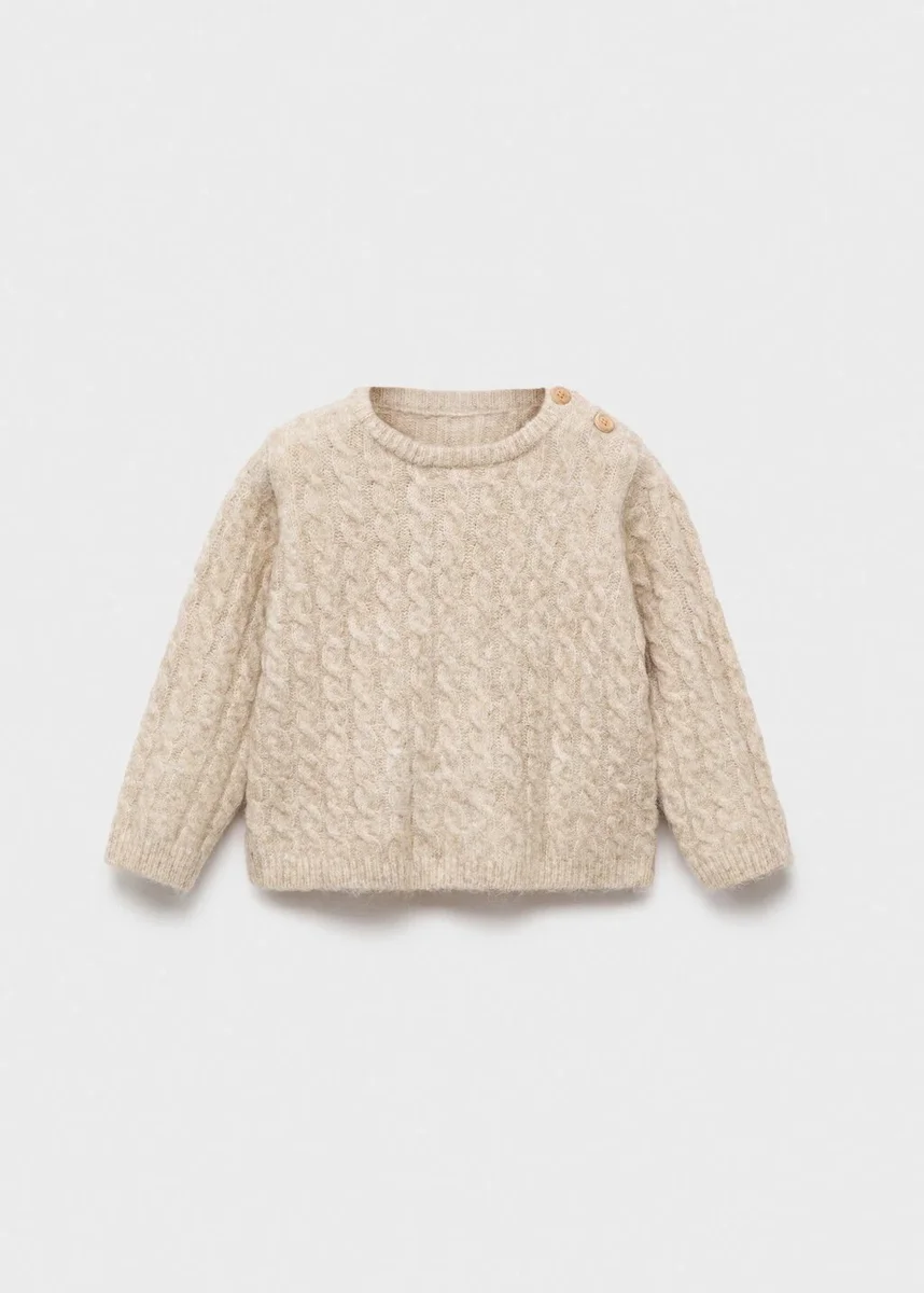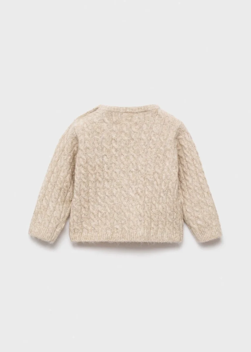 Pletená látka. Kabelkový vzor. Rovný střih. Zaoblený výstřih s knoflíkovým zapínáním. Dlouhé rukávy. Celkový vzhled. Vánoční kolekce. Černý pátek