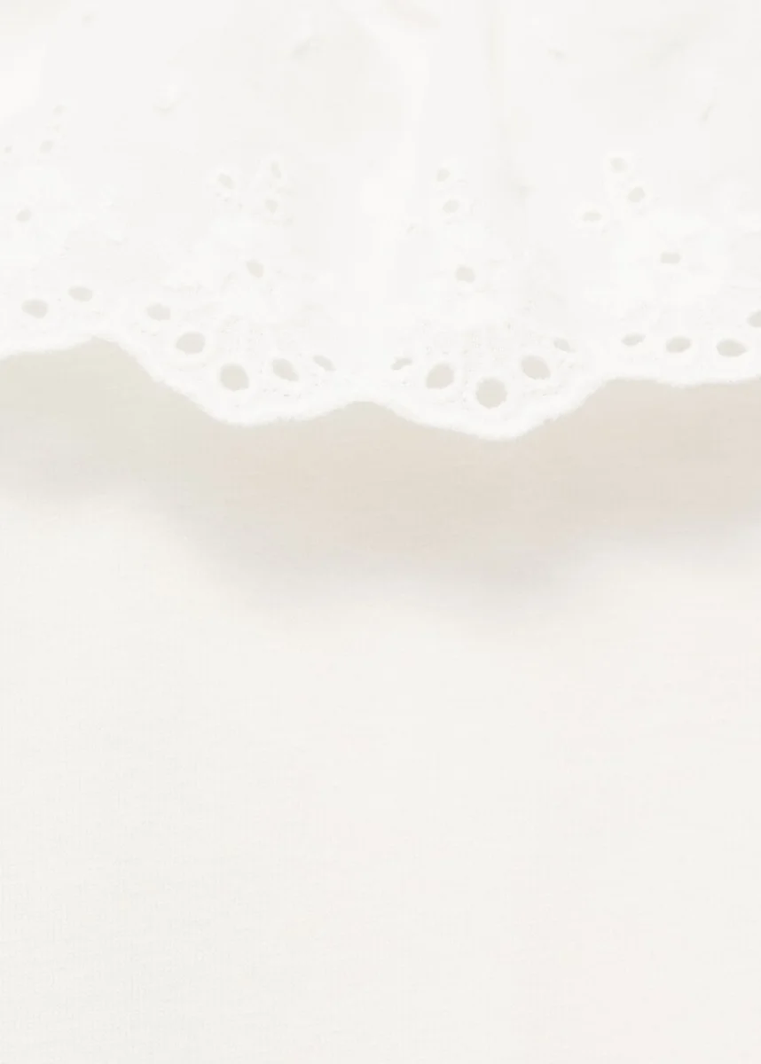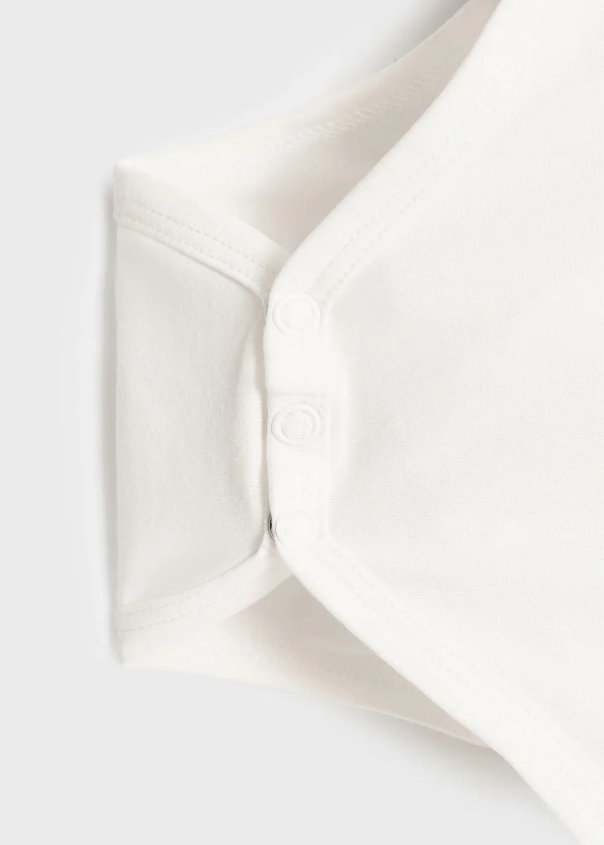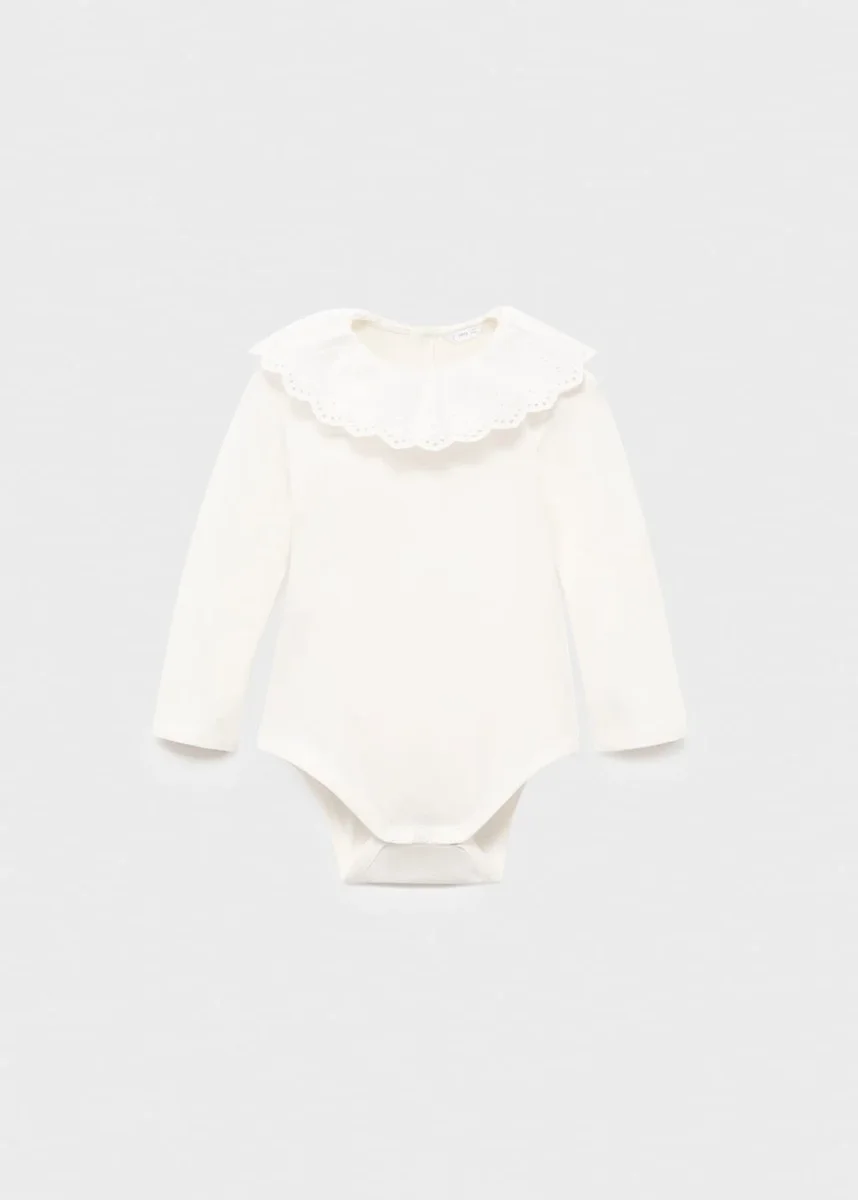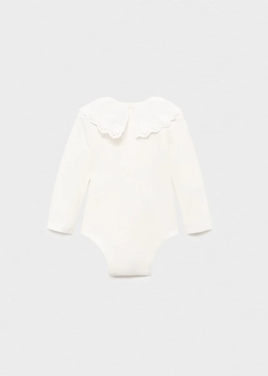 Tento body je vyroben z pružné bavlněné látky a má rovný střih s babydoll výstřihem zdobeným výšivkou. Má dlouhé rukávy a zapínání na druky na zadní straně a ve spodní části.
